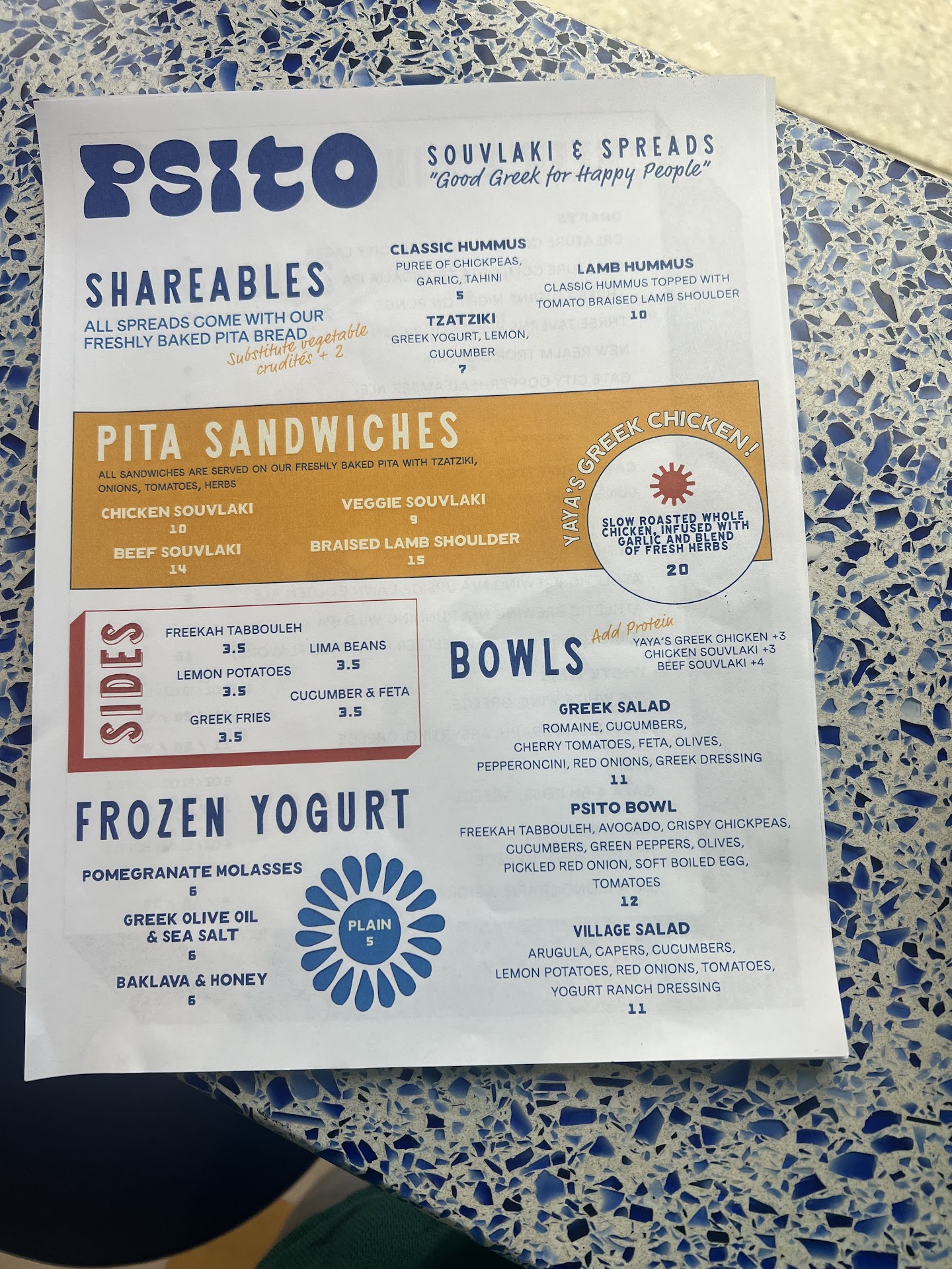 Read moreWhile I dearly miss Hot Dog Pete’s and their amazing chicken tenders, the Psito menu is a fantastic replacement. I do not understand why there isn’t a line out of the door here every night. Psito has become my “don’t feel like cooking tonight” place to go because the food is simple, fresh and delicious, and its one of the best values in town. The hummus has a beautiful creamy texture and the right amount of tahini flavor. With lamb, peppers and pickled onions added, it’s a meal unto itself. The souvlakis are all fantastic. The real standout though is the roast chicken. For $20 you get a whole bird with perfectly crispy skin and moist tender meat. So good. I may never roast a chicken at home again. Make sure you get gravy, just don’t tell your cardiologist. Every side is a fantastic interpretation of classic Greek dishes. The tabbouleh is an herby delight and the lima beans are an amazing surprise. Either wine on the menu pairs perfectly with the food, but the white is a great dry, minerally compliment to most of the dishes. Save room for the frozen yogurt. Oh. My. God. Or, just come here to satisfy that soft serve craving Instead of waiting in the looooong line at Big Softie (well deserved as it is) and try any of the Frozen yogurt toppings. Sweet, tangy, rich, smooth, delicious. Psito is a hidden gem in the treasure pile of Georgia Ave....