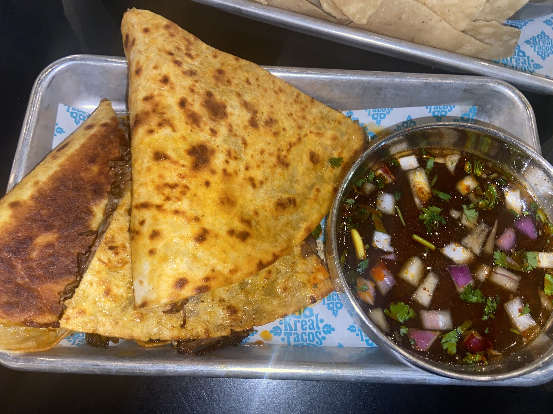 I ordered the Chips and Salsa for an App and the Quesabirria for my meal. The food arrived in good timing which shows that the kitchen has a good process flow. However, for the FIRST TIME EVER of me eating at Rreal, I wasn't fully satisfied with my Queabirria. To be fair, I wasn't unhappy, however, I was slightly dejected by the toughness of the beef. I have become accustomed to the beef being very tender to the point that it almost melts in your mouth. Yet, this time, my meat was a little tough. I had to do a few extra chews per bite which made the food experience moderate.