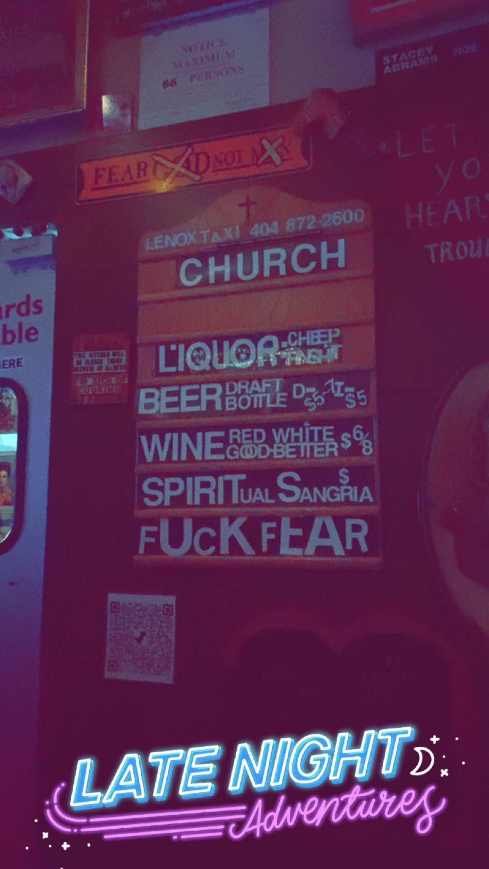 CHURCH! It's a bar. One of the most unique spots I have ever been. Now serving 5:00pm-2:30am & open til 3am 7 days a week (except Sunday where last call is 11:30pm & Church closes at midnight. Unless Sunday falls on the day before a holiday in which case allows the bar to stay open til 3am; such as Sun. Dec 23rd 2018 where Christmas Eve grants an exception) as mandated by GA liquor laws. Church is also open until 4 AM Superbowl 2019 weekend. Sister Louisa has left an amazing where's waldo of trinkets with something new every time. Hollis Gillepsie has freshly appreared on upper walls opposite the lower restroom. I have recently discovered there is a drag show here on the first Thursday of every month and it is absolutely fabulous. Ping Pong Tournament on Monday nights at 9pm with free pizza first Monday of every month, but please bring extra & additional weeks (new commmers. Must tithe Edgewood pizza to be accepted). Organ Karaoke on Wednesday nights 10pm - 2am. Weekends, college breaks, & holidays are packed but with 2 stories, an outdoor patio, and 3-4 bartenders there is space for all with quickly served drinks. $4 PBR tall boys were the only thing I considered ordering here until I found $5 Hopsecutioner. Both serve their purpose. I am sure they have plenty else to satisfy your palate such as spiritual sangria. Cash me round church for some raw & uncut cyphers. Pray for Corey. Also, Katie, I don't remember what you said to me but you convinced me to offer up my Audi Summer of Sales sunglasses from Jim Ellis Audi of Marietta outside of the bathroom. It's been too long now. Upon donning my shades on your head you stated something about not having a hair band. Hey Sister Louisa, I feel blessed to receive a reply from you. Wanna play a game of Pong Wednesday? First round is on me. Brad, I'm sorry I told you looked like a diabeetus spokesperson. Molly, it may have been poor taste for me to say I was looking for you repeatedly as you sat next to me and I'm surprised you both tolerated me so long. Mark, you look like...