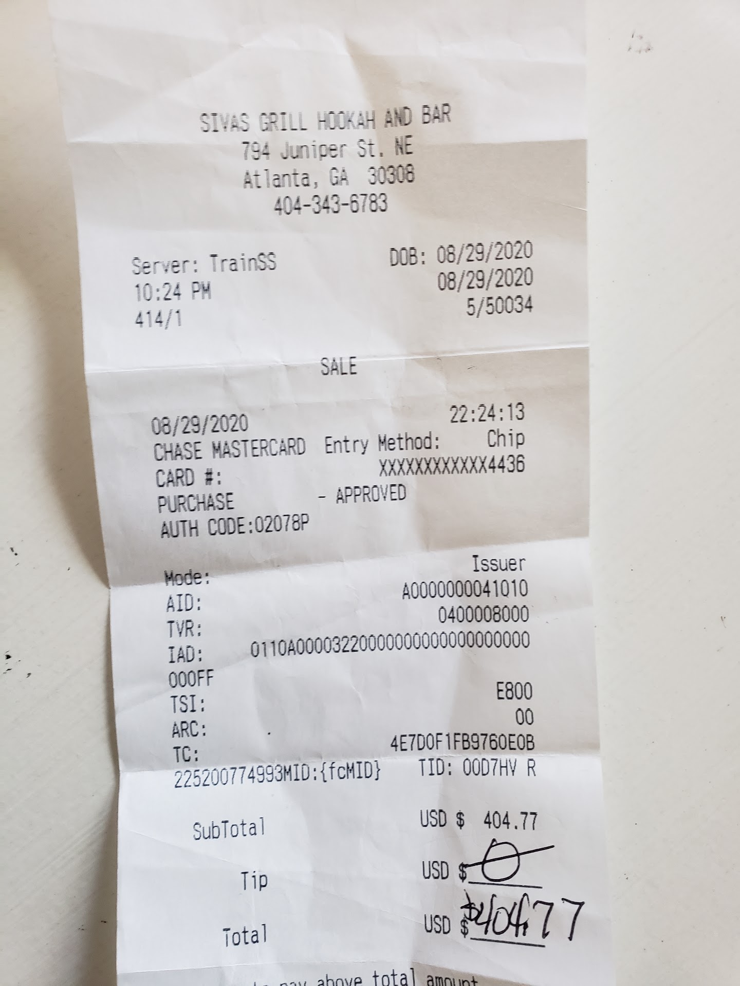 Read morePlease be advise and read my review thoroughly. If you are visiting or residing in Atlanta, do not spend your money here or even consider Siva's business. Myself and 4 other family members came here on Saturday, 8/29/2020,after dinner for some drinks and Hookah. When we arrived, they were holding the line and charging for tables, which comes with a bottle and hookah. We saw many people turning away and leaving immediately, after being inside for approximately 10 mins. After entering, it was only 1/3 full of people and again people were leaving. I paid for the table bill immediately, after being seated, which was over priced with hidden fees, plus gratuity added on the ticket ($404.77, view photo). One of my family members ordered Shots and the server informed him it would be $10 per shot, which we did 2 rounds and it was 5 of us total. Plus, someone ordered wing and fries, small platter. Shots=$100 & Food= approx $25 The ticket was brought to the table and it was for approximately $1,100 and the server, said it was $40 per shot, which he lied and the bill shouldn't still add up to $1,100. After nicely asking him to change the amount, he refused, where I went to the manager at the front door and police officer and loudly informed them of the rip off. The manager went upstairs to settle everything, but my family member had to pay $905 (view photo) to settle the ticket. As we were leaving down the stair case, another guest stated, "they just tried to rip us off with drinks we didnt order". We should have saw the signs, when people were leaving continously while we were in line and the place was more than half empty. *Please take my experience as a warning and dont think twice about this establishment, as it needs to be under investigation by the City of Atlanta and GBI of their illegal business...