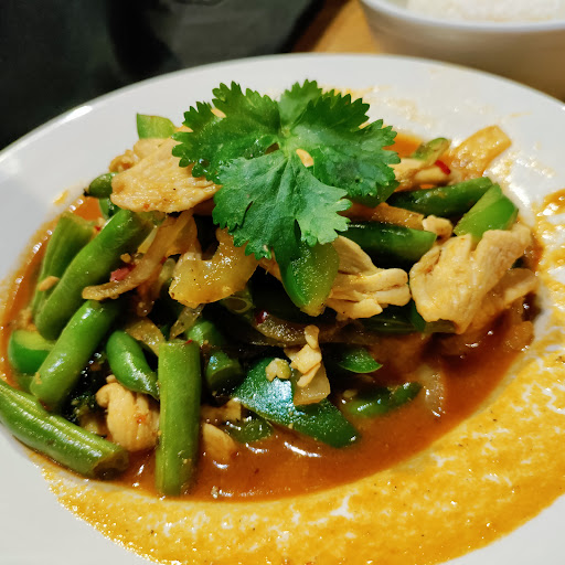 For the main course, I chose the Red Curry (Kang Dang) with chicken. This dish was a delightful mix of fresh vegetables, including eggplant, bamboo shoots, and zucchini, all harmonized with a hint of Thai basil. The complexity and spice of the curry were just right, making each bite a flavorful adventure. We also ordered an extra bowl of rice, which complemented the curry perfectly.