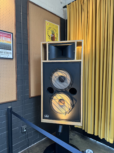 At the front of the room are some of the most expensive looking speakers I've ever seen, which is ironic because most of the music that comes out of them is so "analog" it sounds like it was recorded on a sleep deprived can of beans. Playing low quality recorded twee hipster rock on $10k speakers is a bit of a laugh and worth checking out in itself until you try and order something.