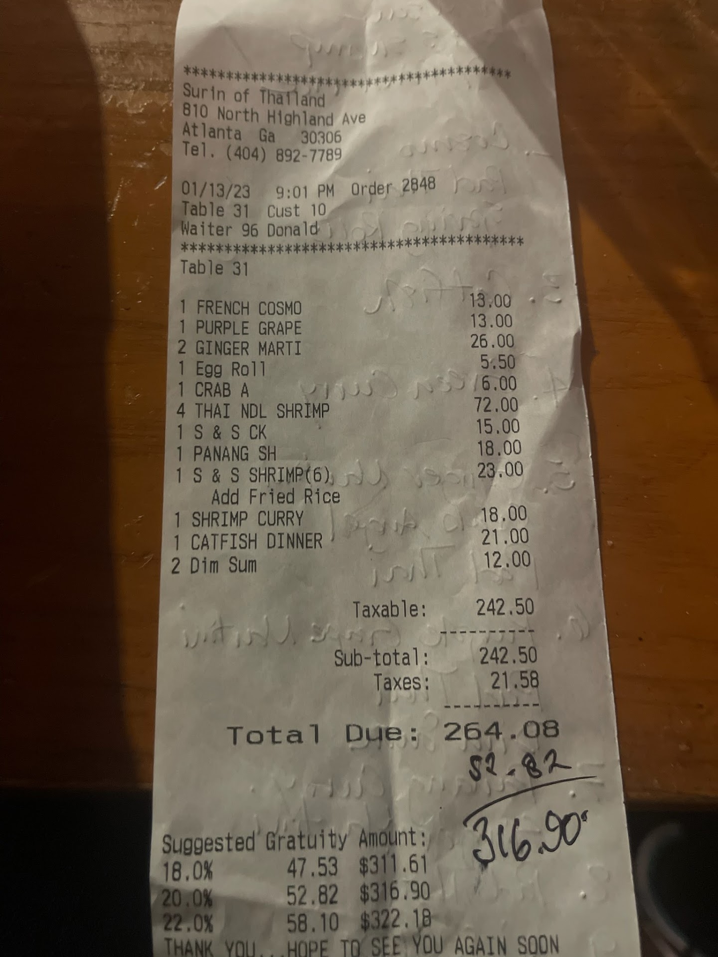 Experiences like this is why businesses fail and why people poorly engage with one another. The level of disrespect, lack of concern for what was in the customer’s best interest and low-level action of boosting gratuity made today THE LAST that I will ever give a penny to Surin’s!