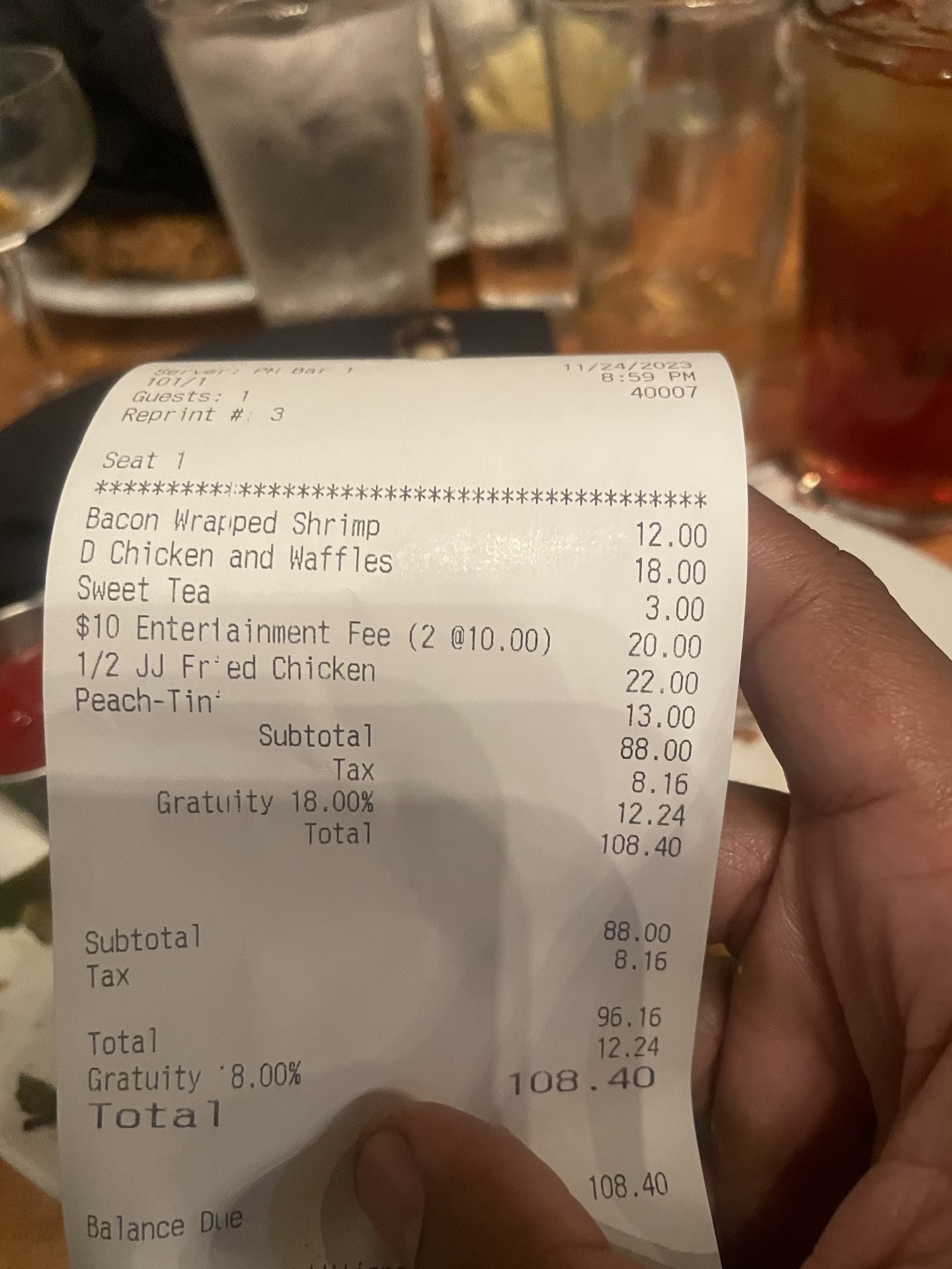 Read moreWe were in the"ATL" from Louisiana for a national conference! Let me tell you about this Juke Joint.....1st off.. we went here in the 1st place because we were told about this place to be a good place to go! NOT!! ( 2nd) If the name..implies "Juke Joint"...how can you try to be a classy joint to tell us to take our hats off, when the place isn't classy.. AT ALL! huh? (3) We had a party of ppl( more than 5) and was told we needed a reservation, when this place was nowhere full! So, we sat at the bar & waited for them to setup a sitting table for us ..meanwhile we ordered cocktails...I ordered an whiskey old fashioned and the drink came out filled half way( maybe a little less), prices wasn't that bad though! Now comes the good part, hostess lady comes over to let us know that our table was ready.....and at that time...she laid it on us that.......there's a $10 per person to sit at the table while the band plays charge & you can't sit to the table no more than 2 hours....! WHAT? HUH? We trying to compute this, so some in our group went back & forth on this...so we said ..well maybe the band is good to hear some good music ! Okay fine, we'll pay it! We were then seated and waitress...Lady Sky came over to take drink orders...she was cool. But service wasn't top notch as they want it to be...my opinion! So, while waiting for drinks to arrive, we look around and seen that the band wasn't ready & playing because the lead singer.....WAS late..(CP time)!!! He went back, got dressed and started jamming, it had a good vibe for about....30 minutes tops and then....the band left the stage and went to the back! WTH! WOW! We didn't even get a good hour of singing entertainment! And we had to.leave because of this 2 hr limit! Moving on to the food.....oh boy! We ordered a variety of dishes but man I'm trying to be good here....none in our group had rave & good things to say...really! One guy in our group ordered basic chicken and waffles w/ a small container of syrup! It really wasn't enough syrup, so he asked our waitress for more....she left went in the back, then came back to tell him that it will be a dollar charge for more syrup! C'mon man...really! Dude we up in here spending money on drinks, band cover charge, the food and u come to tell me that there's yet another charge for syrup! Hell to the nah, nah!! Lol I'm going to stop right here because I've traveled to many places in country and out of country, and I know something is not right about this place!...