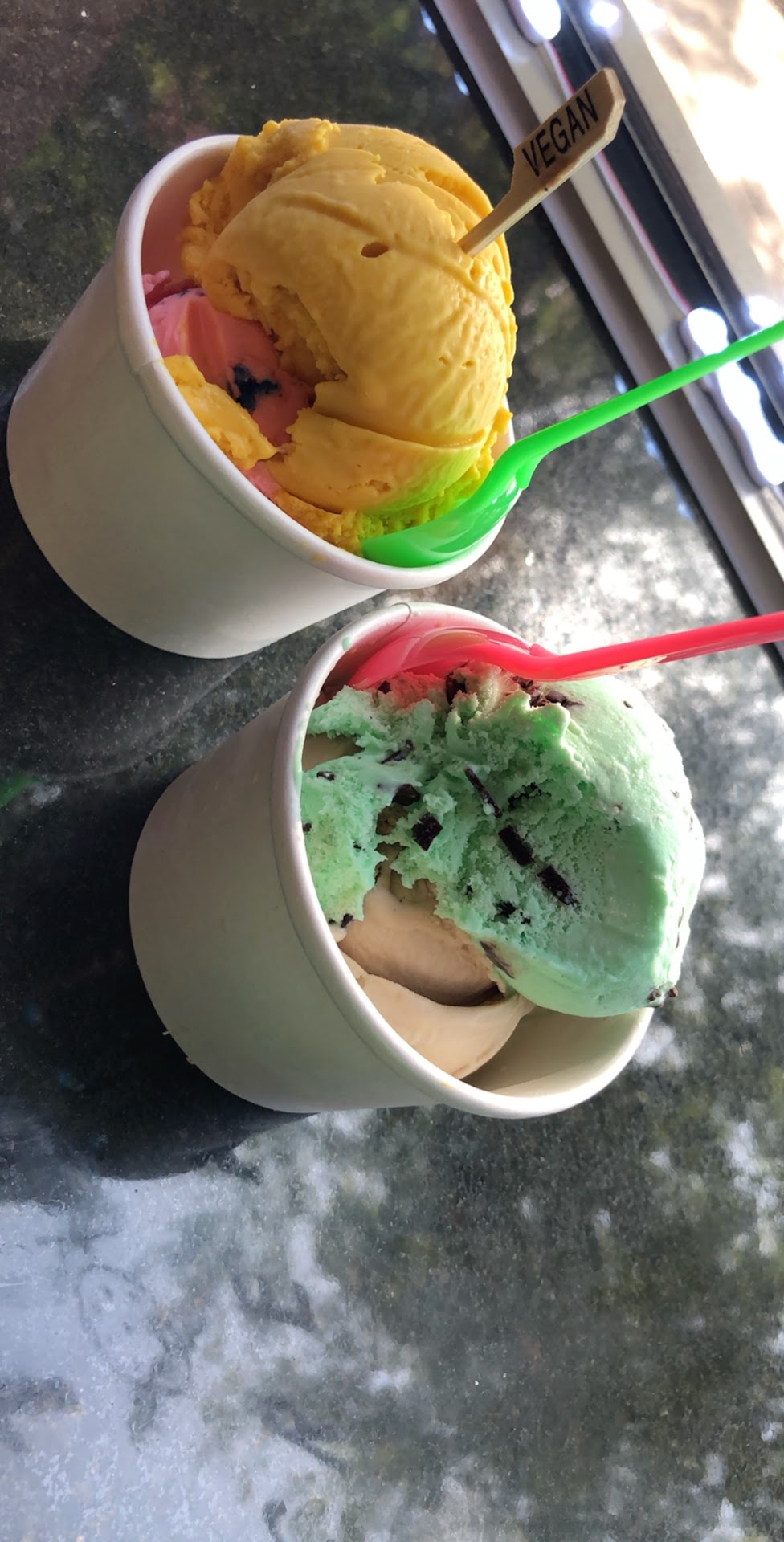 The vegan mango ice cream was absolutely delicious. It didn't taste artificial or overly icy, it was nice and fruity and smooth. I also got some chocolate chip cookies and to my surprise they were actually very good. On my next visit I'm looking forward to trying another flavor and getting more cookies lol. Both of my daughters got traditional ice cream and they enjoyed their...