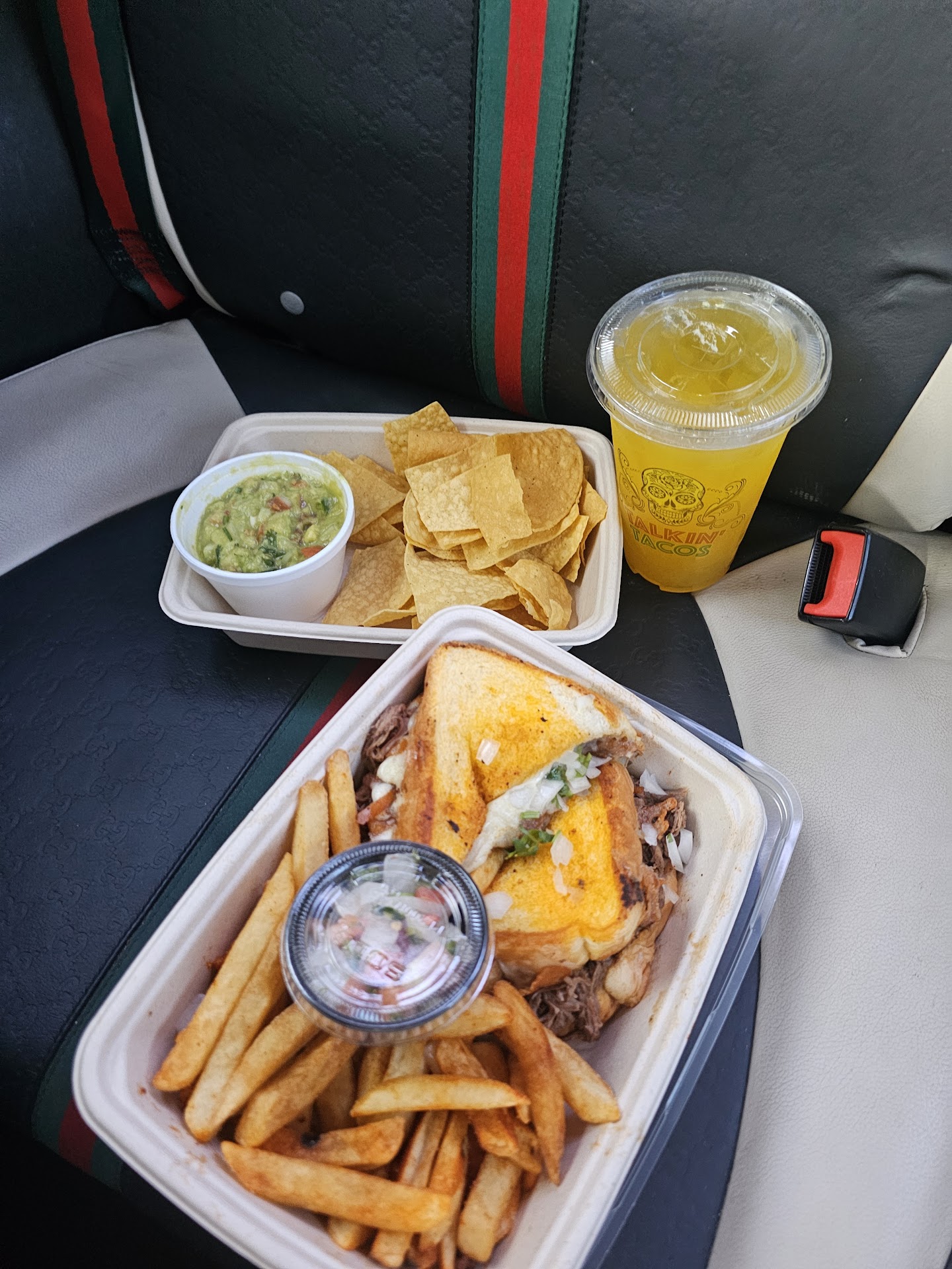 Ā Ā Ā Read moreI know what you're thinking...yes those are authentic leather gucci seats from a limited edition Fiat 500 Gucci! But let's jump into this food. This place is popping and has great potential but no matter when I go for take-out, I can't seem to get fresh food and something's always missing from my order. This place popped up on my ig timeline and the videos motivated me to try it out. I get there, and it was a great vibe. The line was long for ordering at the kiosk but the food came out pretty quick. But what a bummer, food was luke warm, birria Ramen noodles were so soggy they were too soft and mushy. The birria tacos were soft and cold instead of hot and cripsy. The grilled cheese birria sandwich was cold and cheese dried up like it was pre-made and the guacamole was browning with my chips. Fries were old, and drinks were ok. Well that was on a Friday night and things were crazy....so I decided to give the place another try during the day on a random Tuesday for lunch....no lines, no waiting. I ordered the guacamole and chips again and birria grilled cheese w/ fries. They forgot my tomato soup as you can see in the picture and the food was just the same..... old,except the guacamole was really fresh and homemade. Anyway, if you can get fresh food you will be happy, portion sizes are good. I might try a dine-in order to see if food is served fresh. I want to like this place so bad but I had to hit them with the 3 stars until they tighten up. I did request fresh food on my order both times but still "no Bueno". With the prices they charge, this stuff should be right off the grill each order.