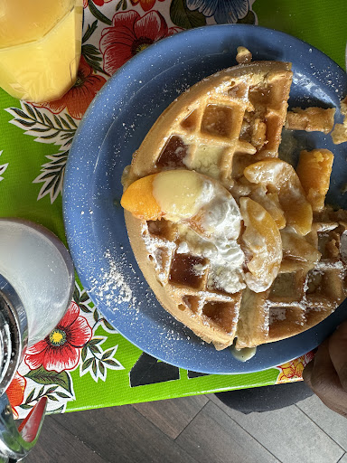 My friend's Georgia peach waffle, while aesthetically pleasing with its generous peach topping and drizzle of syrup and cream, fell short on texture. The waffle itself was dry on the inside, which was a disappointment given the promising appearance.