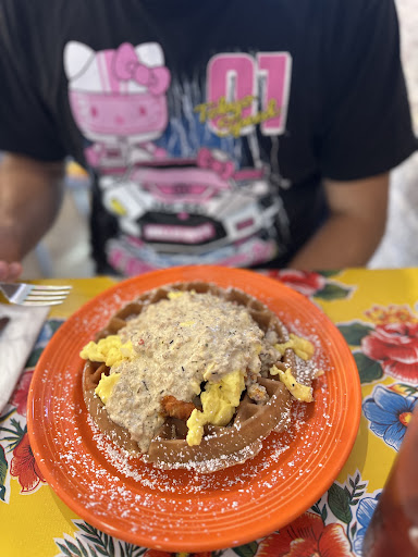 Hot dirty bird’s potatoes were just unedible. As if it was made in the morning and had just sat there waiting. The gravy was yummy but either the chicken or the gravy had made the waffle very soggy and again, everything was COLD.