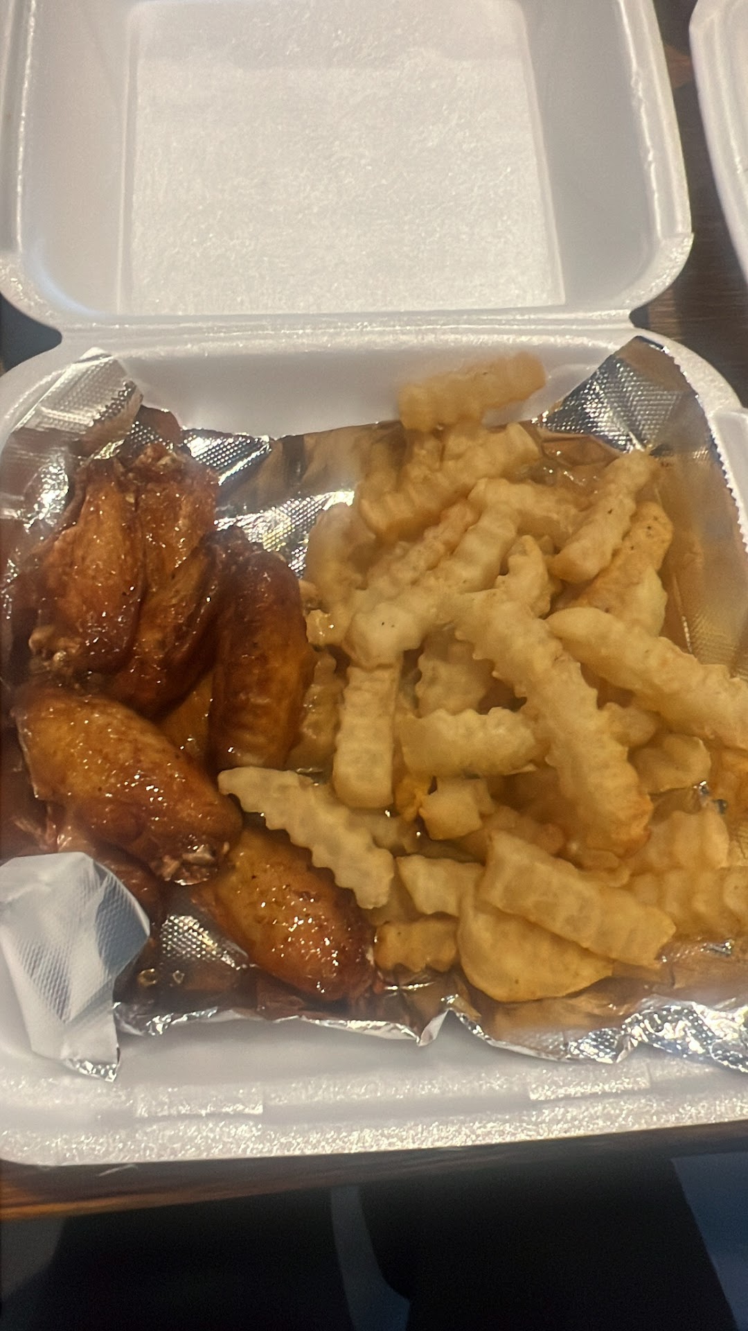On a Tuesday afternoon, I went to this resturant. The ambiance was calm and serene, the restaurant was not crowded, and the workers were incredibly friendly and courteous. They are also marketing their brunch and the upcoming Soul-food Sunday. I got the 8-piece honey wings and french fries with blue cheese. The wings were delicious, albeit a little small for me. I appreciated how the food stayed hot for an extended period of time. The fries were crispy and not overly salty. The dish went well with the blue cheese. They serve Coke products as well as a moderately sweetened pink lemonade. Aside from wings, they also provide boxed salads, which I thought were pricey...