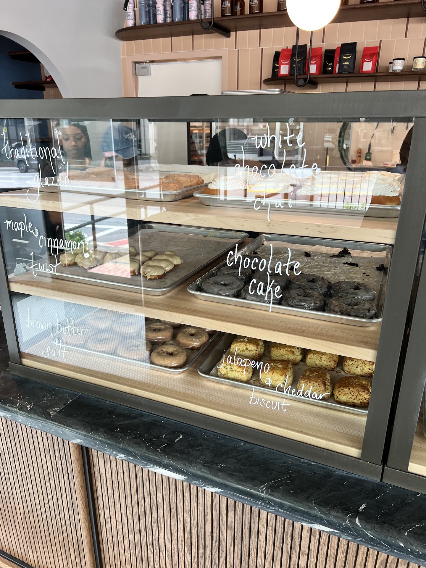 Atmosphere- this is a huge one for me in a coffee shop. It felt very sterile and quiet like a library. It’s small so it should be very clean but it was not. I suggest something to catch flies because with the treats and doors constantly opening your going to have them and there needs to be a plan outside of “oh well”. The vibe was very much work and occupation forward- the employees look afraid to engage with you, because massa might hear! 🤣 One employee hadn’t tried any of the donuts I asked about which is just a shame on mangments part. Tasting should be day one of training. Turn on some music and light a candle, the vibe isn’t there and there’s nothing decorative on the display bookshelf just completely empty. Where’s the life?