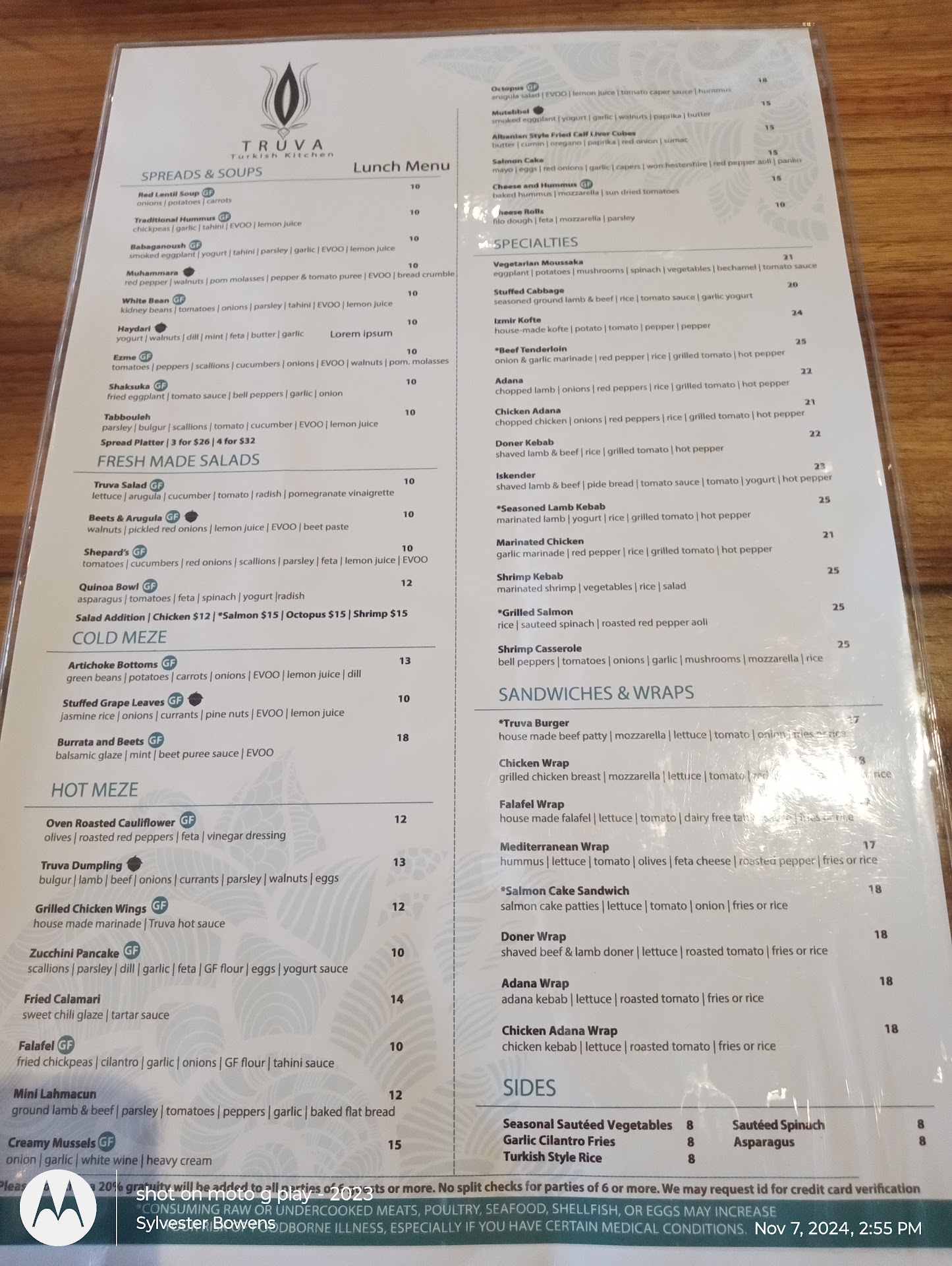 Read moreI've always remembered the scenario from lion witch and wardrobe where Peter when confronted by the ice queen's generosity, The soon-to-be King Peter quickly requested Turkish delight!! Turkish delight indeed. Truva, was not just a dining experience but a cultural experience, not everyone in the establishment is of the Turkish culture but everyone is cultured. The food was surprisingly delightfully textured with flavor, spice and heat, The variety was almost too much to overcome and actually decide on a single starter, and or entree, but first were the drinks, All of which seem to be signature beverages with head spinning juxtaposes of alchemy, I ordered the, basil and gin, along with the calamari which was crispy on the outside and juicy on the inside it came with two dipping sauces one must have been a mango spicy dip and the other a cool cucumber ranch I'm not certain but I am certain that they were both delicious pairings to the dish. The atmosphere is absolutely hypnotic it's like being wrapped in the embrace of a thousand baby kittens lol, classy yet extremely comfortable! Our server was delightful and accommodating and our bartender was absolutely facilitating...! I hope you get the chance to enjoy Truva as we did. Don't be a fool and wait too long All good things must come to an...