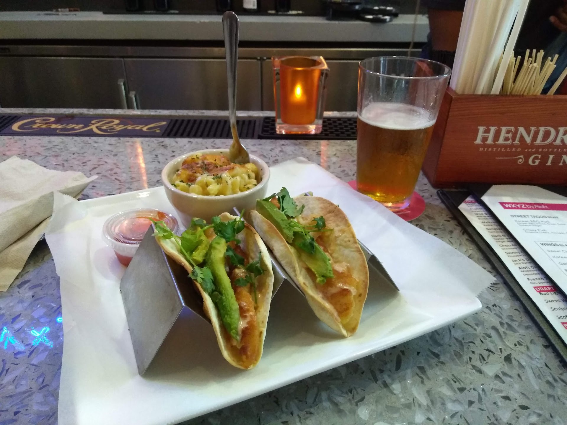 I ordered two tacos with a side of Mac and Cheese and a local beer on tap. It took a long time, about twenty five minutes to come out, and it wasn't particularly busy. Despite the wait, the food was...