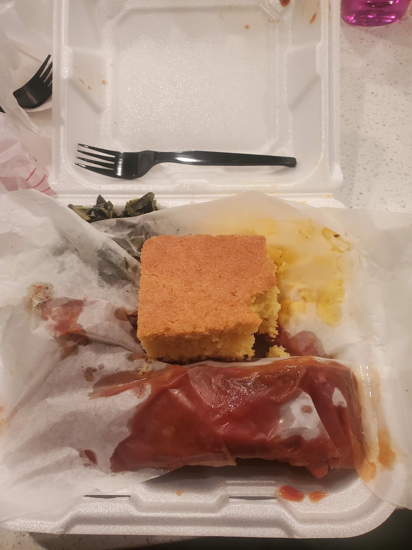The turkey wings were unremarkable and drenched with a yellow, watery gravy that was like overly-diluted canned chicken noodle soup. The rice underneath those wings, swimming in gravy water, was instant (boil-in-bag?) and flavorless. They were out of cabbage, so I accepted the canned turnips, which were seasoned well, thank goodness, but they need somebody in their crew who knows how to make some cornbread. The little square they served me was a flat, solid block. It had no rise, no fluff, no flavor. Just picturing it again make me mad.