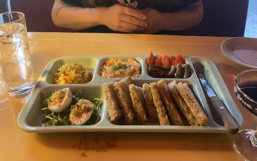 Maybe 40 people can be in here at once. Small but maximized layout for comfortable variety seating. Youâre transformed to a different place with the dark/moody vibe and cool instrumentals. Tables, chairs, bar tops, glassware, silverware, art deco is all correct. Smells like good food is being cooked. Small menu that allows the daily specials to shine. A vegetarian can be happy with these fun eats. A big-back would probably prefer a more American common menu with lots of meat options. I imagine on popular days itâs easy to be packed so have a backup plan or be patient. Sunday evening was cool about half packed with only 1 server and 1 bartender. Surprisingly enough to handle it plus the small menu helps minimize ordering. AC boomin. The beautiful booth tables have a wide bottom base that makes it hard to sit in the middle of the booth without stepping on the base & bending my knees tight so I sat more to one side of the seat and laid my feet across. Felt very comfortable here.