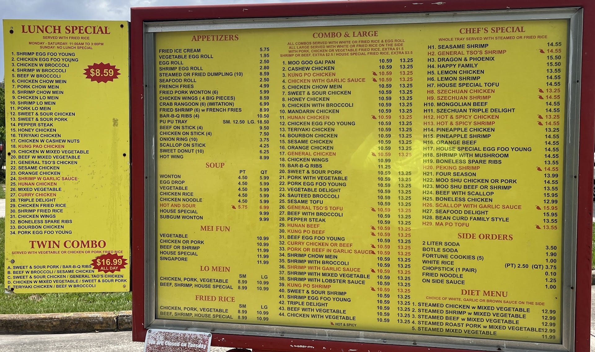 First time picking up from here. Decided to give it a try based on reviews. Small stand alone structure with walk up window. Has a drive-thru. First impression: Very busy drive thru, phone orders, walk-ups, and 3rd party delivery pick-ups. Prices are low. Large menu options. Looked promising.