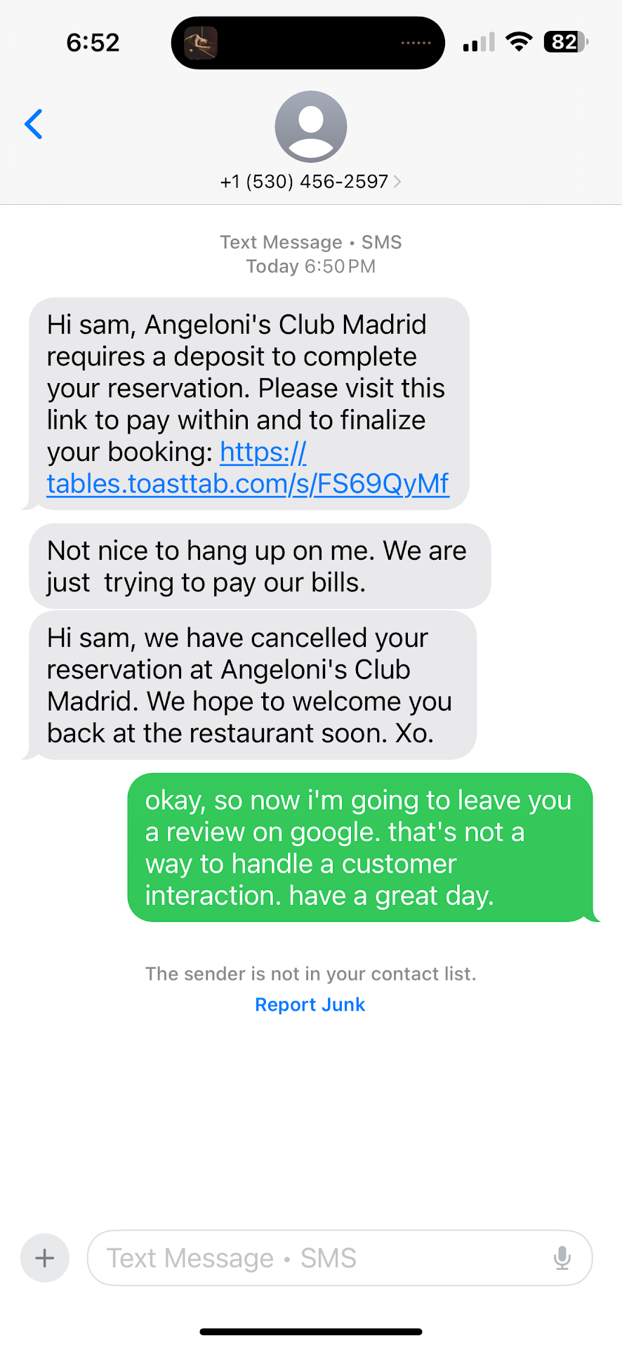 Read moreI called at 6:45pm on Friday, June 13th. I haven’t even eaten here, but I do not want to after the phone conversation I just had. I called ahead to see if I could make a reservation for my 2 girlfriends and I. I was met with an employee/staff member who asked me “okay, can I ask you a bit of a personal question,” and proceeded to see if we wanted to eat in the lounge or the dining room, and said we would be expected to pay at least $50 a person if we were where the DJ was (the lounge). I was okay with that until the staff member kept talking about how they have to pay the DJ and how they had a bunch of cancellations last weekend, and they can’t pay their bills if they don’t take deposits. They then said we would be expected to pay a deposit of $20 a person. I have never been expected to pay a deposit for a resultant that I haven’t even stepped foot in. I, once again, would have paid it if the staff member didn’t keep going on and on about how they had 57 cancellations last weekend and how they don’t want to take deposits, and how they need to pay their bills as a company and pay their staff… I was immediately turned off, tried to end the conversation, but I physically could not because the staff member would not stop talking about how they needed to pay their bills as a restaurant. I said “I think we’re going to go somewhere else because I wasn’t aware this was going to be so involved,” to which he said “well it wouldn’t be so involved if people came to their reservations,” and I just hung up. I don’t do that normally but I was not interested in the reservation and I couldn’t get a word out to this staff member. Then he proceeded to text me on the company phone number and I have those texts below. It is EXTREMELY unprofessional to say those things to a customer, especially if so many people have canceled, there is probably a reason. I don’t know who the staff member is but they’re not great at promoting their resistant by sharing how many people have canceled their reservations. This was absolutely insane to experience. 10/10 for entertainment, but I won’t even consider...