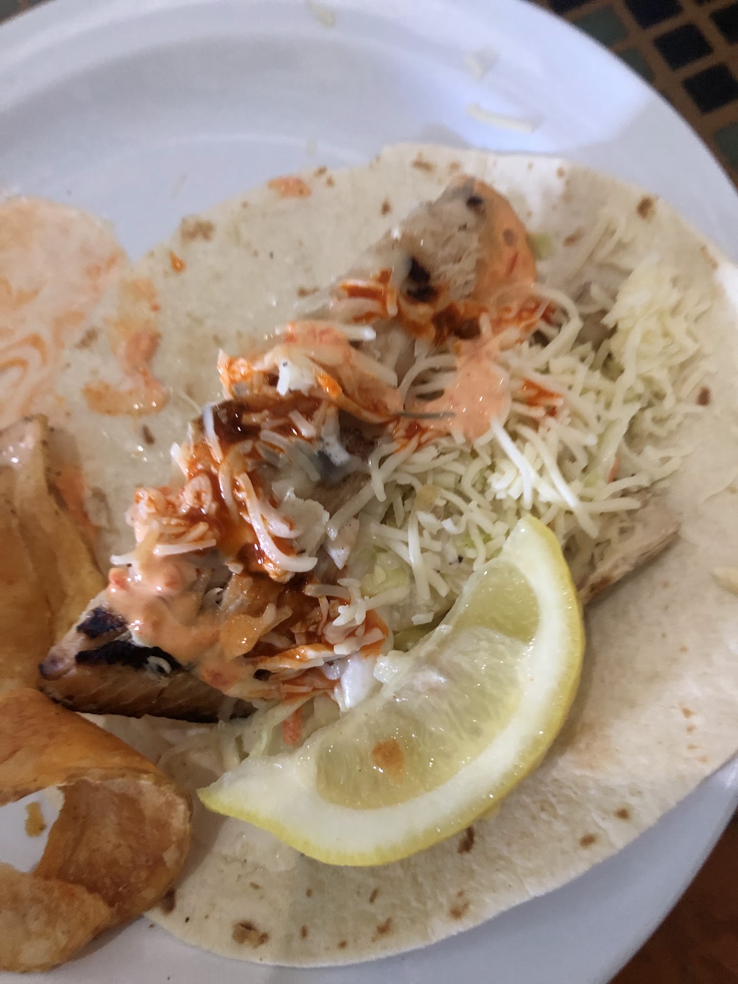I opted for the loaded chips. They came out cold. I thought the whole idea of house-made real chips was that they were supposed to be in just-made status: hot. The toppings were just ok. It was blue cheese dressing that I feel tasted like a run-of-the mill bottled dressing, blue ch. crumbles, tomato, a small amount of bacon bits that were not improvised bacon, green onion. Mostly chips, though. I picked through a lot and ate the ones that caught the most dressing.