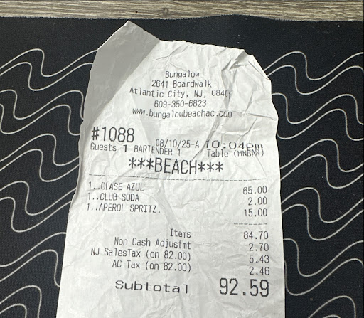 The Experience: Our plan was to grab a couple beach đș's near the corner where it was quieter, but the đș's were pretty dirty. I understand there is going to be sand on them, but these were actually quite stained and dirty. We reluctantly sat and I immediately found myself replaying the very strange experience I just had. The weird entrance, being stopped, the arm around me, the strange questions to the bartender, the terrible drink and then of course the fact that the two drinks cost me over 40 bucks... C'mon man... this isn't an upscale Manhattan lounge it's a mediocre â± front bar on the AC boardwalk.