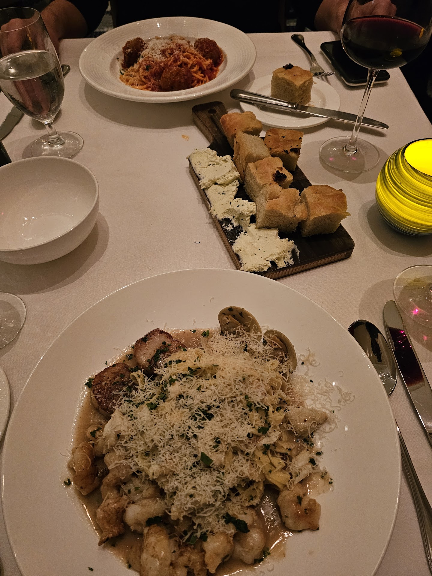 Second trip we were piglets and had a pasta dish before our dinner. We tried the papparadelle bolognese – wow, we would get this as a main course any time. Super tasty and nice quality to the meat. The pasta was cooked perfectly, if you’re a fan of al dente. Our main courses were diver scallops and surf and turf. Not a usual choice for us in an Italian restaurant (even with the name Dolce Mare – Sweet Sea), but “when at the shore!” Great choices, both of them. I ordered my scallops well done (I’m not fond of wibbily textures) and the chef knocked it out of the park. Interesting accompaniment of beans, carrots, endive. Very tasty. My bf enjoyed his filet, which was cooked medium to perfection. Deliciously crunchy sear to the meat and the lobster was very good as well. Sorry, no room for dessert, but I can tell you that many people were ordering it and they all looked amazing.