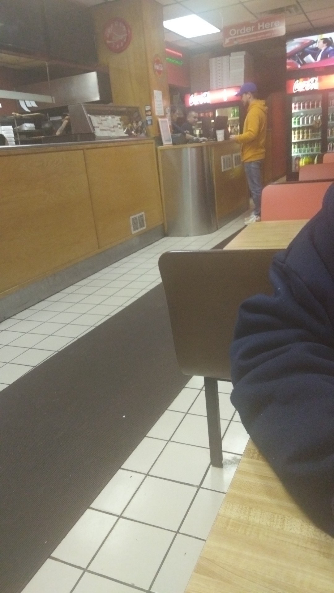 When you enter, there's seating to the right, and the kitchen/grill/pizza station to your left, with a glass case displaying assorted cheesecake and pie slices. The restrooms are located in the corridor between the seating & kitchen area to the back. The place to order is located on the left, towards the back. Closer to the soda refrigerators. I ordered a slice of pizza and a soda, as well as my companion. The pizza came out of the oven quickly, and was given to us on plates in a box. Where we were encouraged to dine in or take out. We chose to dine in, and sat in a booth. We added condiments to the pizza, that was located on the side of the grill. Upon my first bite, I knew the pizza was cooked earlier in the day, as it was dry, and too crispy. It was not the worst slice I've had, that was older, and reheated. Yet, it was old and reheated & they do a lot of business, so you'd expect them to have at least a pie that was fresh for dine-in customers. I also ordered a slice of cheesecake. Although it was creamy & tasty, the size was very small. Not at all justifying the price of $3.75. They seem to do a great take out/ delivery business, and are extremely busy. Which leads me to believe the phone orders take precedence over dine in orders. Thus,, me receiving an older slice. There were a few diners, but most of the business appeared to be delivery or takeout. Also, there were a few to go patrons scattered throughout my time there. Turnover rate was quick in takeout and dine in, and the phone's were constantly ringing with orders. I wouldn't recommend it if you're getting a couple of slices, or a slice...