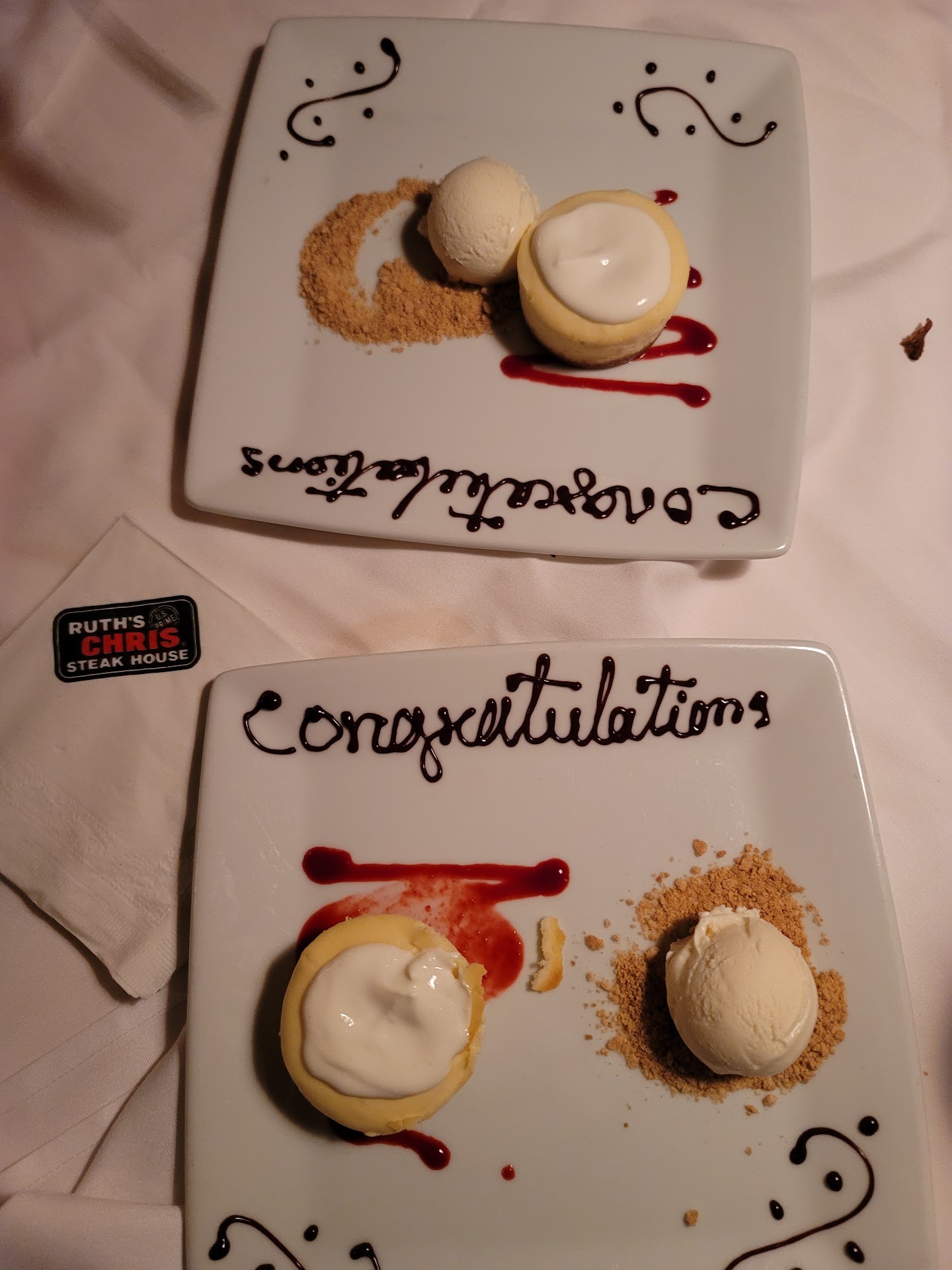 All I can say is perfection is not easy to achieve with everything, especially when you have all pro eaters like myself and my buddy. I've been itchin for some Ruth Chris, so, while in AC, I made the move. Not 1 regret. Our waitress, the host, and the manager made our visit there perfect. I recently retired from a NYC Agency and have been on a celebration kick. The waitress asked us at the very beginning of our meal, are you here for any occasion? And I was kinda caught off guard to have someone actually care about why we were there, so I told her "we both just retired, so, this is kind of a retirement getaway for a few days" We're 46 and 44 years old, so, she was surprised but, none the less, she had a plan for us. (We'll get back to that at the end) So, we ordered pretty much the same thing, Lobster Bisque for appetizer (OMG) and we decided to split the monster porterhouse for 2 with unbelievable Mashed garlic Potatoes which is one of their staples. We didn't order any drinks or wine, but, for your reference, they have a fantastic wine/food pairing they offer which are great deals,, CHECK IT OUT. And we both knew, after eating the porterhouse, Mashed and bisque, dessert would be unnecessary. So, the Bisque was ABSOLUTELY AMAZING. I personally love Lobster Bisque and I've had many over the years at different places. This Bisque took me back to when I was 21 and worked in Boggianos in Rockaway Beach, NY. They had FAMOUS lobster Bisque there. The one at Ruth Chris was absolutely on point and similar to the one I loved for so long and have missed all this time since Boggianos closed down. Next: Dinner. Michelle our waitress, who was one of the nicest and coolest people ever, brought our porterhouse for two at the perfect time. As she served it, she followed safety protocol and warned us about the 500° degree plates over and over, which I appreciate on a professional level. Buuut, yeah, I still burned myself cause I'm a dope (not serious whatsoever). Do yourself a favor, use one of the folded napkins and lay it over the side of the plate closest to you. Anyways, the plates were drenched in butter for dipping which I loved also. The steak was cooked to absolute perfection and left a steak taste in my mouth for an hour afterwards that made me want more, even though, I was so stuffed. We both finished our meal, well, what we could finish, packed up some leftover steak (almost 1/4 to 1/2 of the steak. It was huge) and we thought we were done for the meal, so, I committed to asking for the check the next time I saw her which was after the table had been cleared, when she asked us "would you guys like some dessert?" ......we just looked at each other and said "uhh we can't fit anymore food down our gullet, so, we'll pass on dessert" So, the next time I saw Michelle, I attempted to ask for the check and she was walking with 2 plates in her hand, before I could even ask, she said "okay guys, I spoke with my manager and told him you guys both just retired and since you guys were so nice, I wanted to do something for you, so, he authorized me to give you guys these. Congratulations to the both of you on your retirements" She placed 2 cheesecake a la modes on the table with chocolate and I think a raspberry or strawberry sauce that spelled out "Congratulations". Oh.....and that too was absolutely delicious.