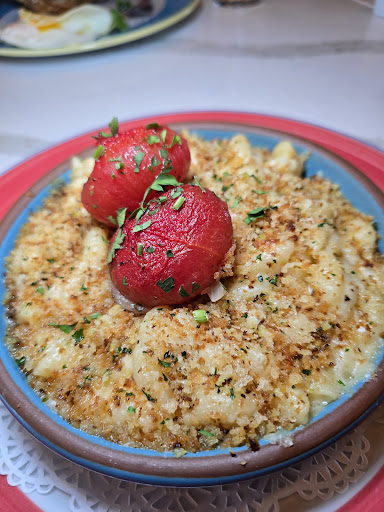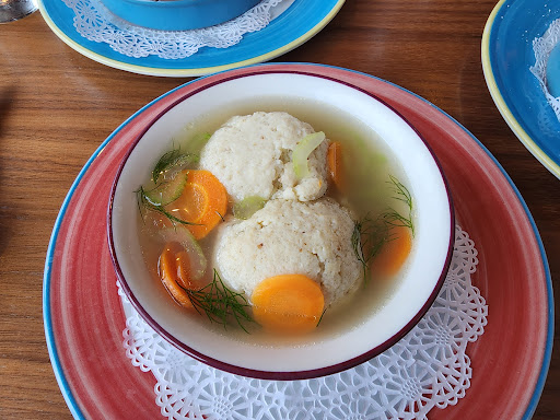 We loved The Elvis French toast. Two thick slices piled with peanut butter whipped cream, bananas, bacon, and maple caramel sauce. It sounds heavy, but it was surprisingly balanced and fun to eat. We also tried the matzo ball soup, which was rich, comforting...even on a summer morning.