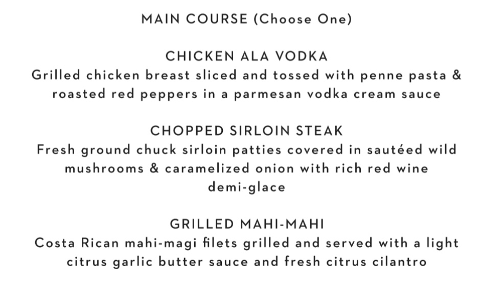 Entree choices were Mahi Mahi, chicken Penne A La Vodka and chopped sirloin. All entrees were served with garlic mashed potatoes and sauteed zucchini.