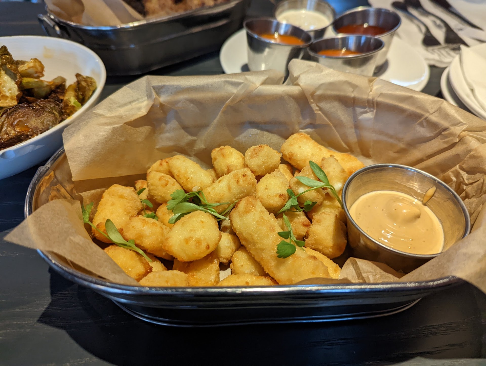 I wasn't too hungry, having accidentally eaten some heavy Mexican food earlier in the day, so we opted for nothing but apps - cheese curds, thai chili chicken wings and brussels sprouts. I concentrated almost exclusively on the curds, though i sampled one or two wings and thought they were fine (I'm not a huge wing person so don't rely too heavily on me in that regard - love eating meat off ribs, hate eating meat off wings). The curds were very good. I don't know that I've sampled a ton of them and honestly most were probably consumed at a Chili's, but like almost any bar app, it usually comes down to how heavy they are on the frying. These were fried perfectly, not overdone, and weren't greasy as a result. The Millennial Chum was perfectly content on the other side of the table, munching happily on the brussels. I've learned through time and experience that she can be pretty high maintenance when it comes to that particular appetizer, so if she's signing off on them, that's a solid endorsement.