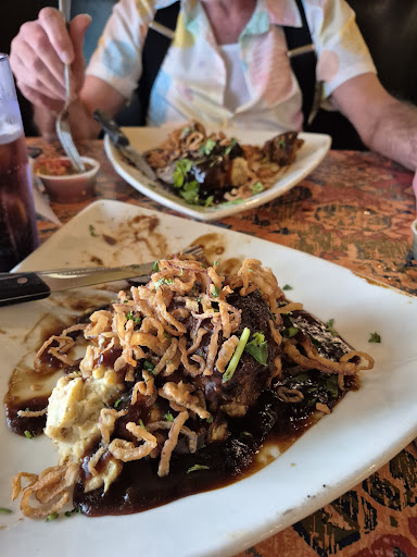 Inside, the Hostess was, very friendly and showed us to a booth in a well lit, brightly colored, Mexican themed dining room. It was very clean, not loud and quite inviting and pleasant. Almost instantly, our server appeared with a smile on her face and in her voice. She introduced herself as Sally and took our drink orders. We looked over the menus as she got our beverages. There were so many delicious sounding things we were torn as to what to get and relayed this to Sally. She suggested something far removed, from what we we're looking at and her suggestions sounded so good, that is what we ordered. (I waited tables for 13 years and learned that when a server, especially one that has worked at an establishment for many years, as Sally had, you listen and take their advice without fail when it's offered. Period! So, we ordered the Meatloaf and the Pot Roast. Both came with a delicious demi glaze and chorizo mashed potatoes topped with fried shoestring onions.