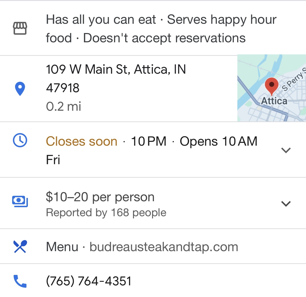 Read moreMyself and a group of several friends met up to catch up for the holidays the day after Christmas, a total party of 8. We arrived around 7PM, sat in the newer section of the restaurant, & everyone ordered food and drinks. At 8:50PM they shut off the TVs and music. I attempted to order another drink at 9:15PM and was told the bar was closed. At 9:20, a gentleman began mopping the floors in the bar and the area we were sitting in. At 9:30PM we were asked to leave because they were closing early, meanwhile online it states they close at 10PM. As a group of young women just wanting to catch up in our small home town restaurant/bar like we typically do during this time of year, I was completely appalled and frankly disgusted by the actions of the staff. The new motto of this town is “Make Attica Great Again” however, the actions of Budreau’s customer service is why so many Attica resident go out of town for services. I can’t speak on the food as I didn’t have anything to eat but the prices for drinks were affordable and our waitress was kind. Needless to say, for someone who doesn’t live here anymore & comes home for holidays to see family & visit friends, it is unfortunate this was my experience....