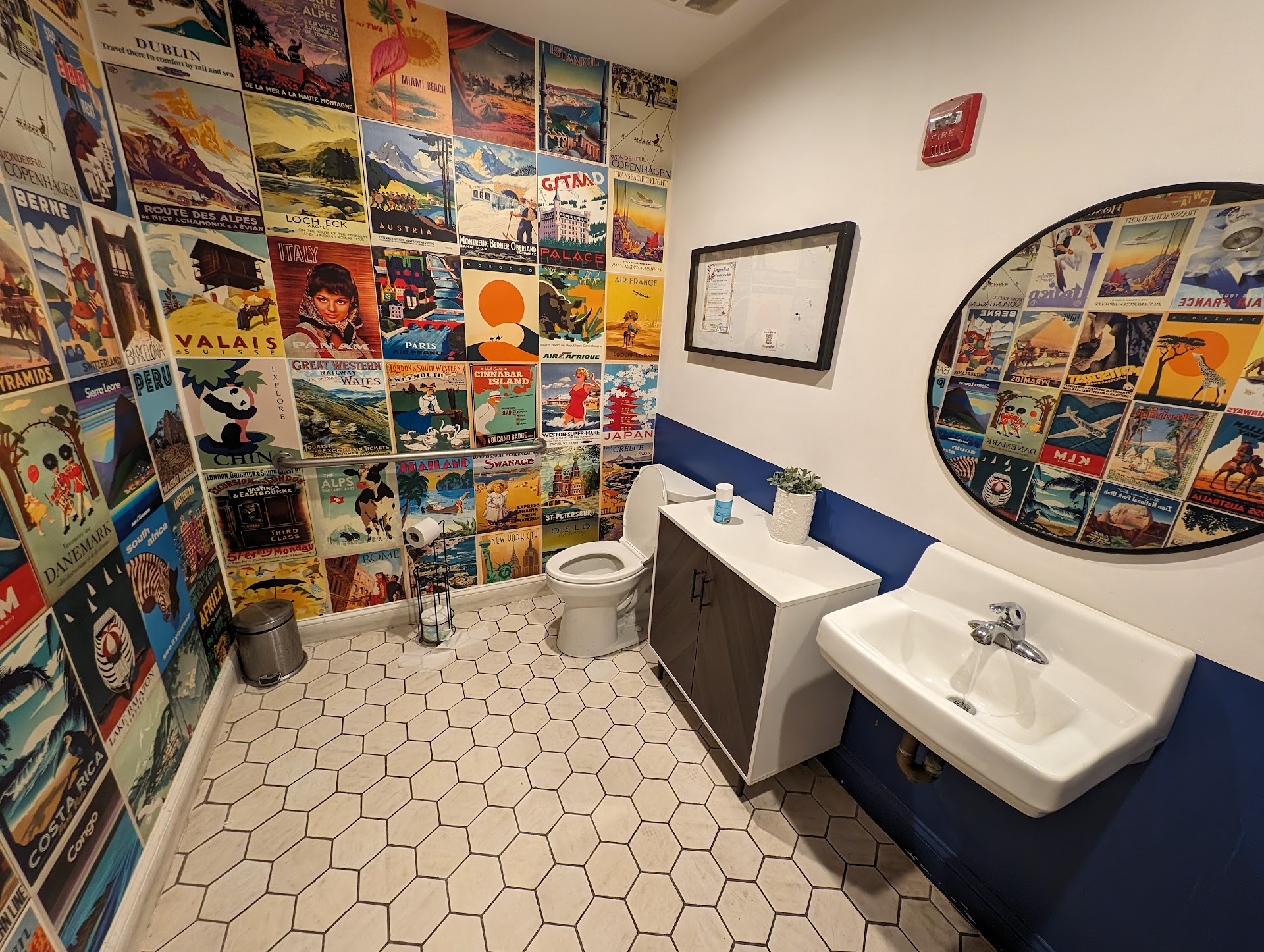 The bathrooms are beautifully decorated and the toilets flush easily without kicking back at you, which is good for weak hands.