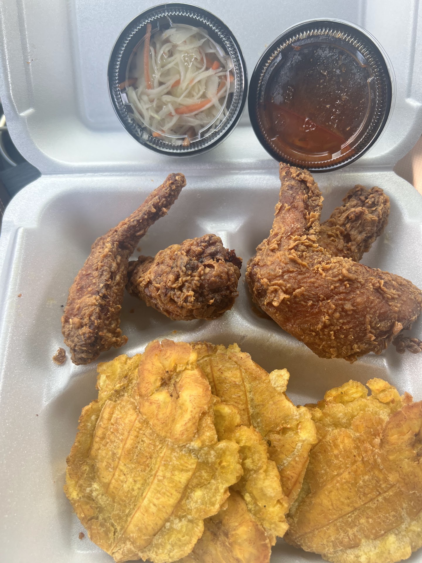 Read moreUpdate: So excited from my 1st visit I returned brought Fritay, legume, wings and boulette, totals with drinks was $100, the food was just okay. Seems the oil they were using was old and the banan was fried and refried cause it was a bit hard. Nothing like the 1st time you can see from the color difference in the two pics the dark looks burnt complete waste nobody really ate it. Legume was okay not salty. Opposite experience from 1st time. 1st visit: Found them on google for lunch omg I have to make it a point to go back I know everything else must be amazing. Friendly service, great to chat with. Wings were the best around, plantains needed salt not season but a bit of salt over all it balanced out as I dont like overly salty foods or ladled with MSG and Sazon, gives me a headache, it’s horrible and over consumed. Gout was perfect,...