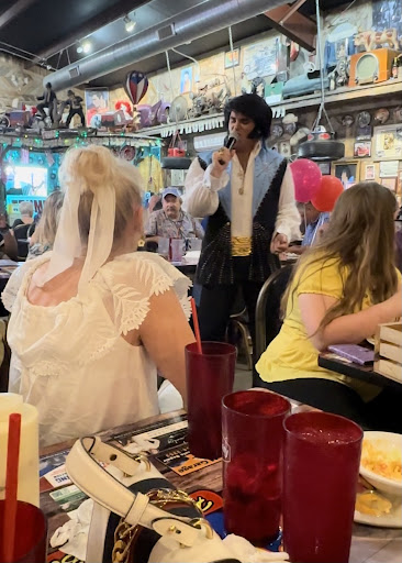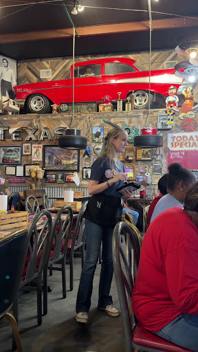 Great morning ride to the cafe' and was cheerfully told by the wait staff to feel free to sit anywhere. This place has a great and fun spirit to it with a ton of Elvis, hot rod, and a 50/60's jive. Lots to look at...