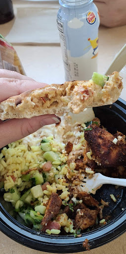 This was my first time trying Hummus & Pita Co. My partner used to eat here regularly when he was working security for a couple stores at the beginning of Covid, and he would rant and rave about how delicious everything was. We'd come to the mall today to get out of the house, and by dinnertime realized it was easier to get a bite where we were than drive all the way home. He immediately got in line for here, and since I couldn't decide what I wanted, I figured it was worth trying. Never had shawarma in my life, or most of the options, so I asked the kind gentleman working the counter what he thought was good. Shawarma, sun dried tomato hummus, mediterranean salad and rice, spicy garlic paste, and feta cheese, stuffed into a delicious pita.