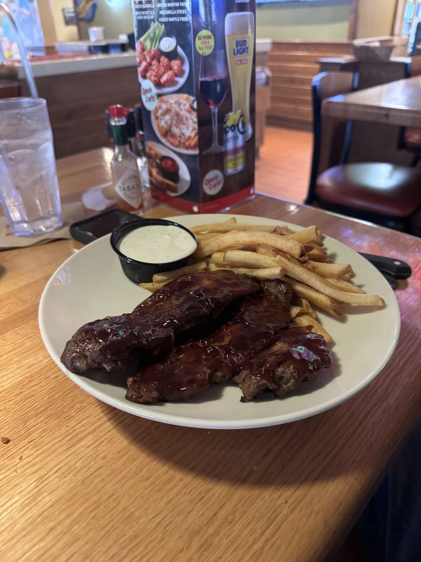 Ā Ā Ā Read moreI had always liked Applebee's, but this time, my experience was far from good. First, they had a wait time with almost half of the restaurant's tables open, and the reason I think it was to missing someone in the kitchen. Which is fine, and that is becoming more common nowadays. Then, they were in the middle of changing shifts, so the previous hostess told the new girl that the 1st party in the waiting list needed to go to this number and the 2nd one to that other table, to which the girl did nothing... After 15 minutes, the ladie came back and just sat us down with a bad attitude. Then, we had to wait for the server to just come and say that he would be right with us. This was after another 10 minutes of us sitting down. Then, another server came, just for the drink order, to which I told her that I would like to olace the whole order because I was not going to wait another half hour for the server to come, so she took the order. The drinks took so long that the short staffed kitchen sent the appetizers at the same time as the drinks... After the server brought the drinks out, we never saw him again until the en when another lady came to us asking if we needed something else, so we asked for the check. After paying, I wanted to get the receipt, and we waited another 20 minutes until we decided to just leave because I couldn't believe that to even bringing a piece of paper someone had to take that long. I do understand that there are a lot of challenges for the service business, but I think you need to keep in mind that if you decide to raise your prices, you are giving your customers what they are paying for.... We had the ribs, and they were overcooked, and that is the reason why I did not give 5 stars...
