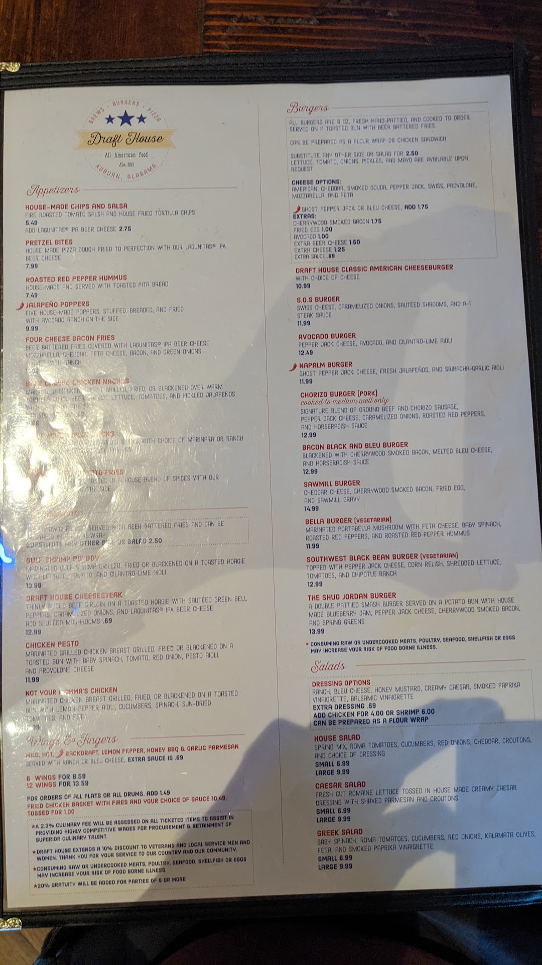 Read moreGenerally good food, sluggish service. Very disappointed in our experience tonight. Had to leave a review after our experience. Have eaten here a few times over the past year, always enjoyed the food. Service has typically been extremely slow, I always credit it to the fact that's it's usually no more than 2 wait staff running the entire restaurant. Tonight, after a long wait, we decided to give Draft House another go. Tonight's drink specials were $5 "select" pints, neither the wait staff nor the bartenders nor menu were able to tell us which drafts were considered "select". One of our party ended up paying over $11 for one beer because of this lack of clarity. Our burgers were fine, but two of our party ordered fried chicken, one was a chicken tender basket, the other a fried chicken sandwich. Both were served kid's meal style frozen, pre-breaded, processed chicken patties straight out of a bag. We have had DH's usual REAL chicken before, and it's delicious. This was not even comparable. No mention was made of this before or during our order or we would have certainly chosen something else. Over $30 spent between 2 people for what was essentially Tyson chicken tenders. Not generally one to complain about a restaurant. We have enjoyed DH in the past, but this trip was a deal-breaker.