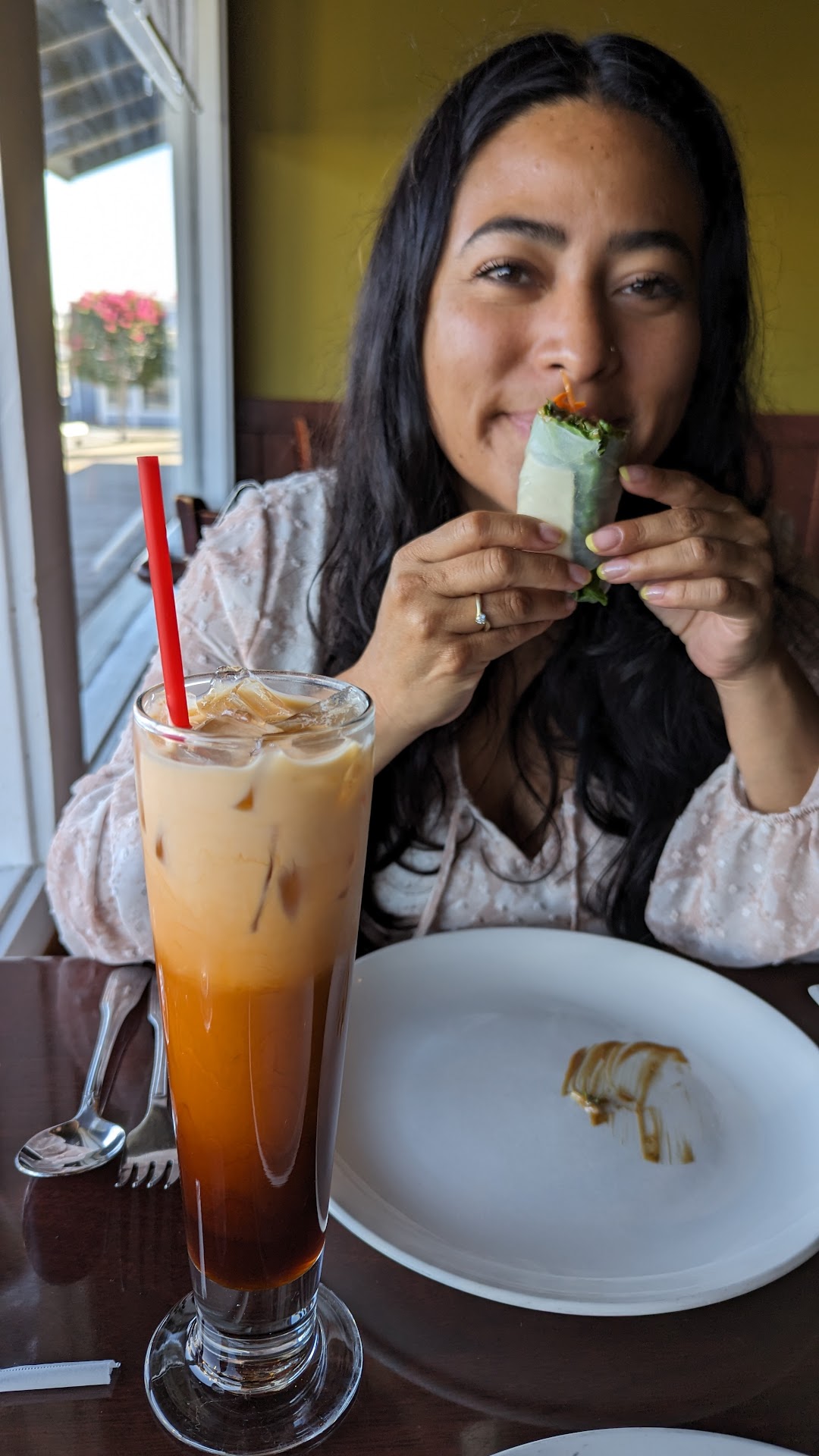 Now to our drinks and appetizers. We had a Tai iced tea and a Tai iced coffee for our drinks. This is actually the place that turned me onto Tai iced tea and I love it. And for our appetizers we had the golden vegetable rolls and the Tai Spring rolls which are wonderful and refreshing.