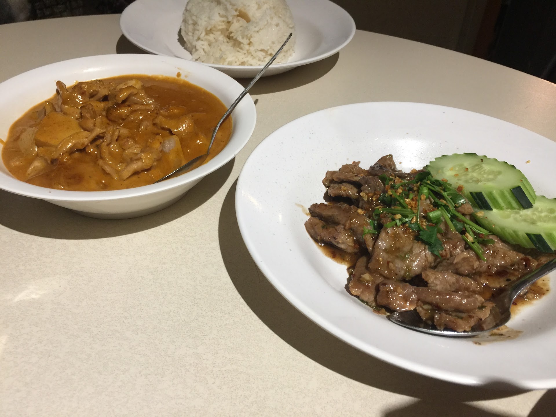 The staff are very friendly. During lunch, the restaurant was pretty full and the staff of 3 people managed to get food and service out in a reasonable amount of time. They were also constantly busy with to go orders and phone orders. We are greeted with a traditional Thai welcome phrase, asked to pick our own seats, and water+menus were given to is shortly after.