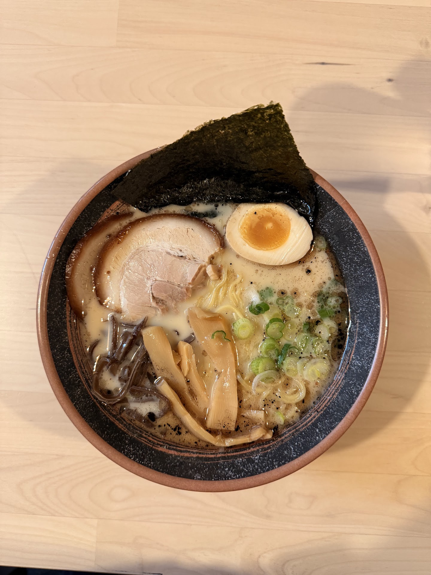 A weathered menu on the table like a ransom note. I ordered the black garlic tonkotsu with an egg—because when in doubt, follow cholesterol.