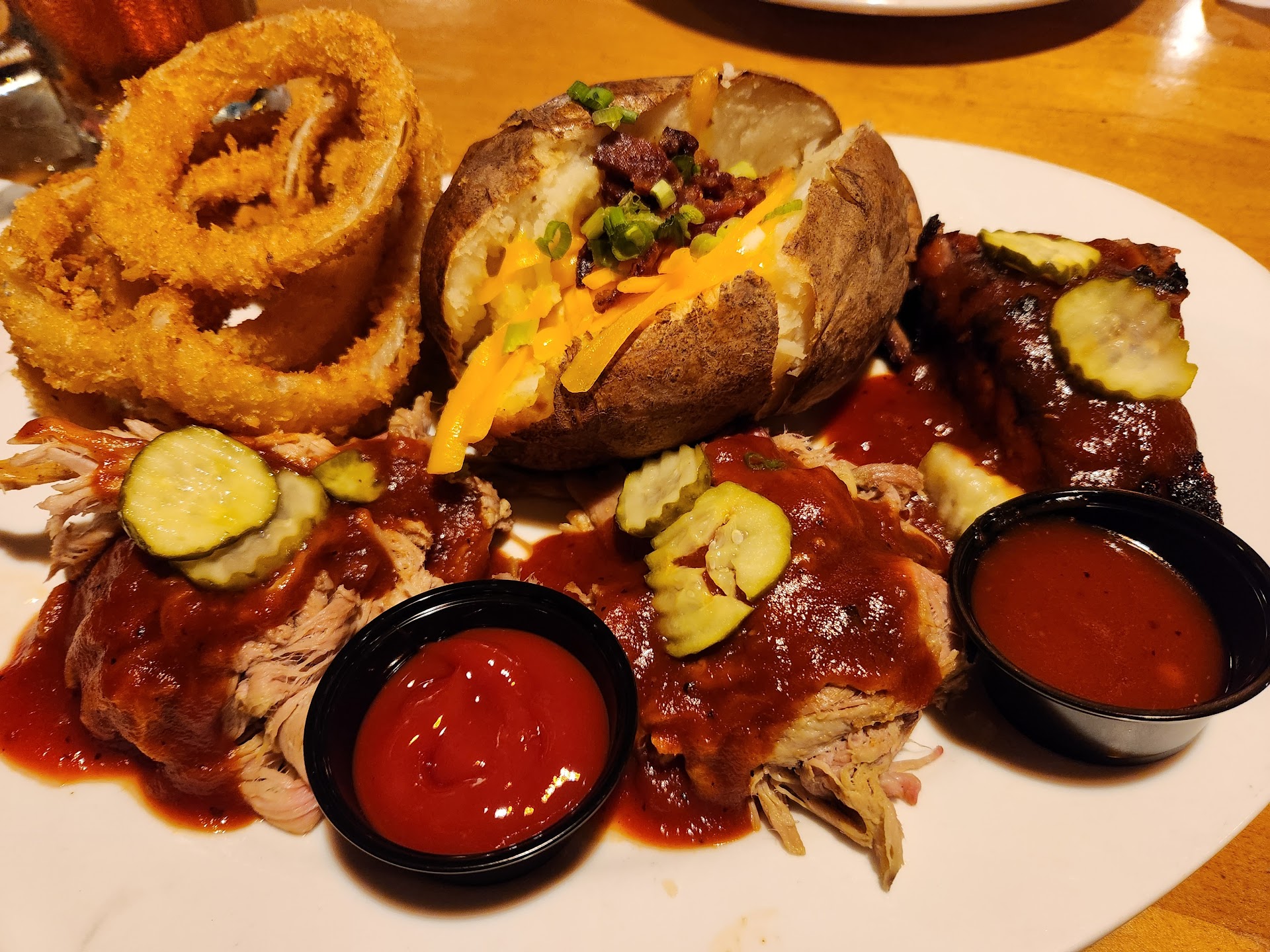 The ribs were good and sides were good. But the pork had no bark, just stringy and the brisket was half fat and what was sliced was tough to chew.