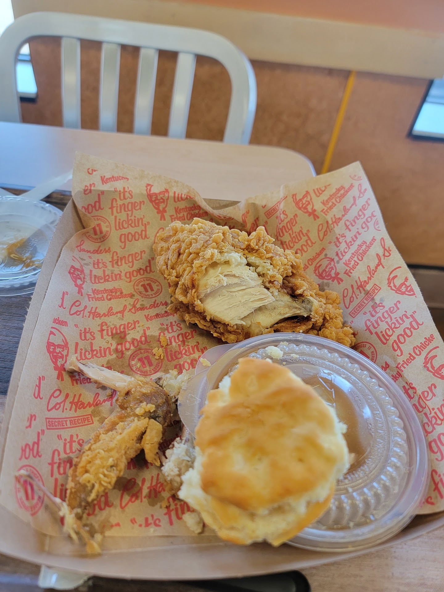 Read moreKFC is a predictable place to eat for the most part. The chicken was better this time. We ordered Extra Crispy & we got Extra Crispy. The previous 2 visits, we ordered E.C., but received regular without any explanation or apology. There is no point in reporting errors to the restaurant. No make it right policy evidently. Both times told, "we'll try to do better next time". If we had eaten in the restaurant, I don't think the issue would/ could be "solved" the same way. But when take out is ordered, picked up in drive thru, and any problem isn't discovered until arriving home, issues aren't dealt with the same, or at all. KFC is one of the most expensive fast food restaurants out there. Over the years the chicken pieces have shrunk. All of the sides are a literal fraction of what they used to be. A family side used to be a quart,(and you got 3), 2 biscuits each, & 2 gravies which were full pints. I have looked at family pictures of KFC picnics, confirming my memory. Now each person gets equal parts side & gravy, none a quart or pint. With a family of 6, each one would get approximately 1 piece of chicke & 1½ tablespoons of each side. KFC is one of MANY take out restaurants that "deal" with Employee mistakes the same way. My other half is the one who likes KFC. I personally wouldn't return after 2 major errors not being made right. It is not just this location or brand that deals with "mistakes" the same way. It seems to be...