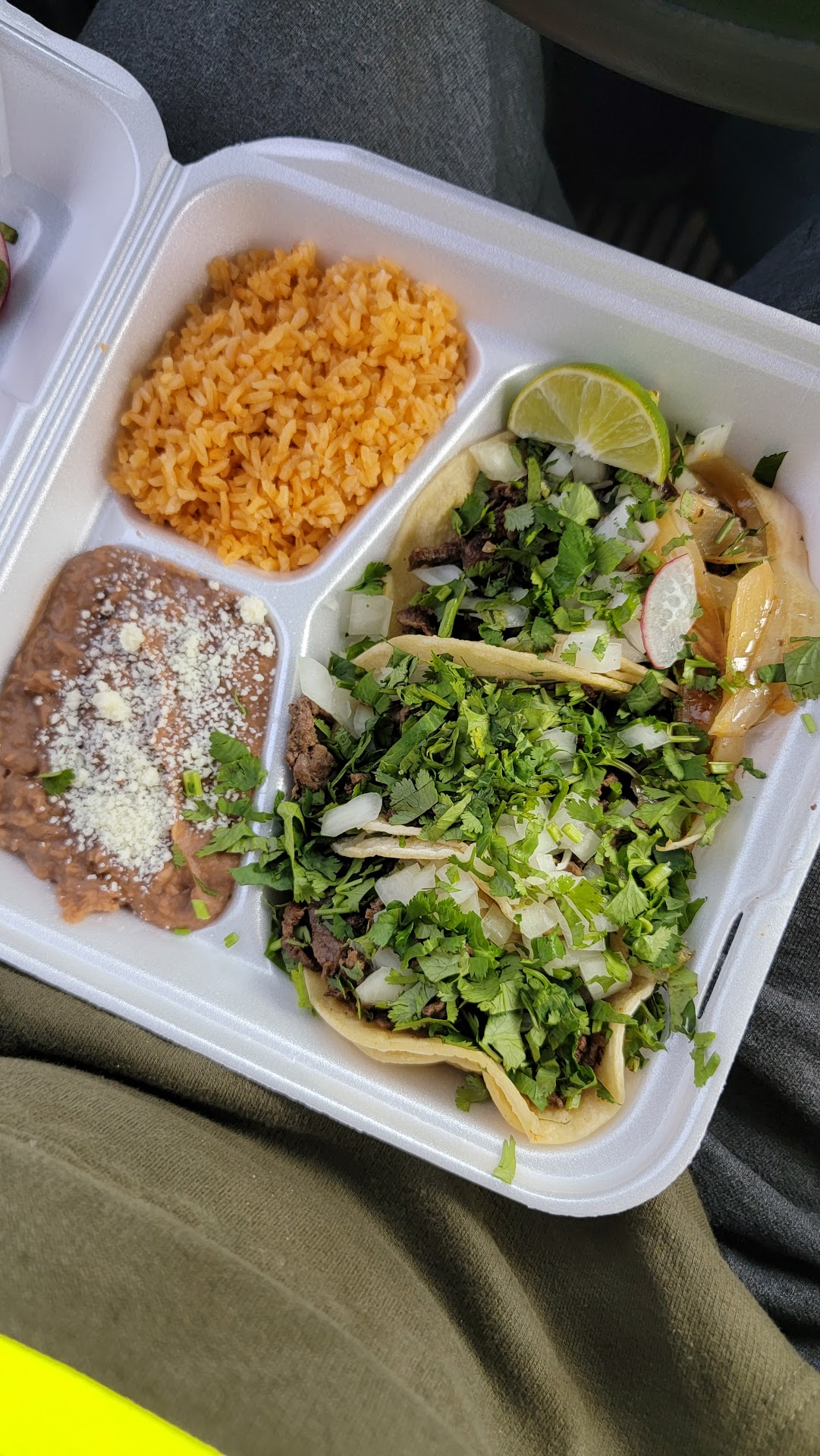 Read morePretty solid place, the truck the food is served out of doesn't look very appealing when you pull up, but you can't judge a book by its cover ! The tacos were very good. Asada was juicy and only found 2 chewy pieces I couldn't eat. Very good. Tortillas on the tacos were hot and fresh. My only complaint with the tacos is that they don't come with sauce on them, and the Verde sauce they gave me was slightly watery but good none the less. Where this meal fell short was the rice and beans. The beans especially weren't very good. Not gross but not "good." The rice was OK. But as long as the tacos are pretty solid, im happy. BUT the best part is this whole meal was under 12$, so for that price, I can't really complain about anything. I would definitely recommend this place. Also had lots of...