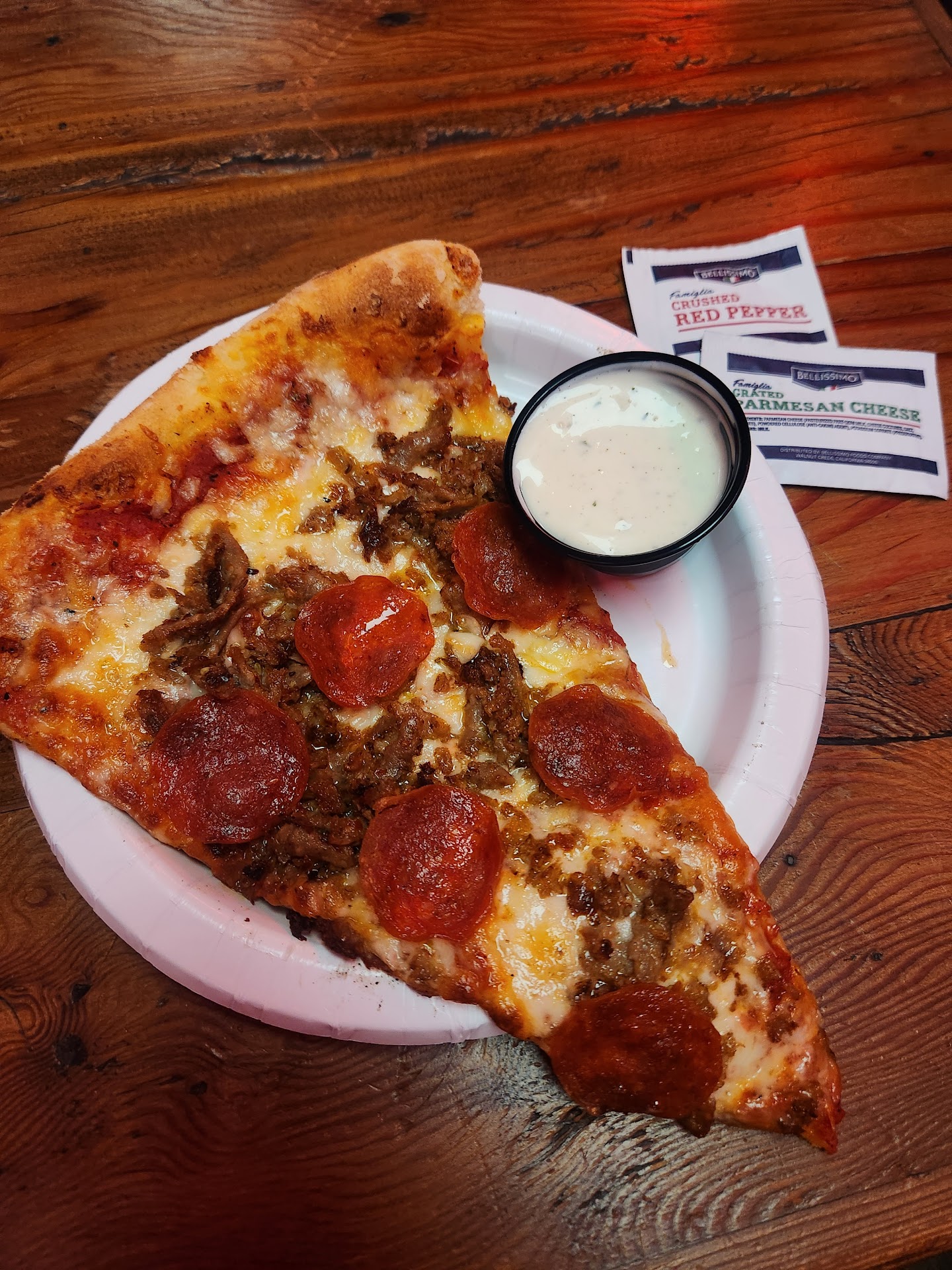 Read morePizza is always hot and made for you!! Pizza by the slice is the way to go, it was delicious!! They add toppings to your slice then cook it. I actually prefer this rather than having like 10 pizzas made that you have to choose from like some places. The staff is super friendly and they are also patient when we had never ordered there before. We went on a Friday night at 10pm in April and it was busy! There are tables of all sizes inside to sit at. They serve Pepsi products. They do give you a water cup if desired. We ordered a slice of pep/sausage and it was so so good!! I also got ranch to dip it and it tasted great and was 55 cents. The individual slices are like 12inches long and 5 inches wide. The crust was fluffy and so delicious, not burnt either. We also got an eggplant 6inch sandwich. I will say that I had to buy the 55cent marinara to put on the sandwich because it just needed something. The eggplant was a bit chewy. But the marinara was delicious, probably homemade. They have an ordering system that just works, where you get a number at the top of your reciept. They call your number on a microphone and you have to show a receipt at the...