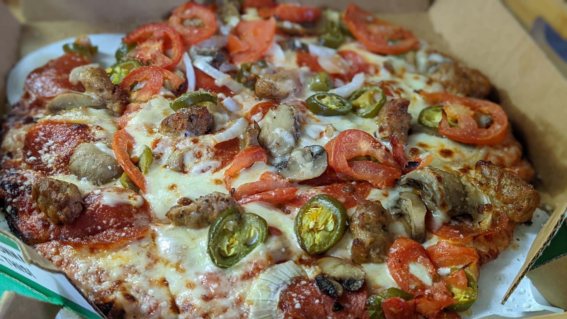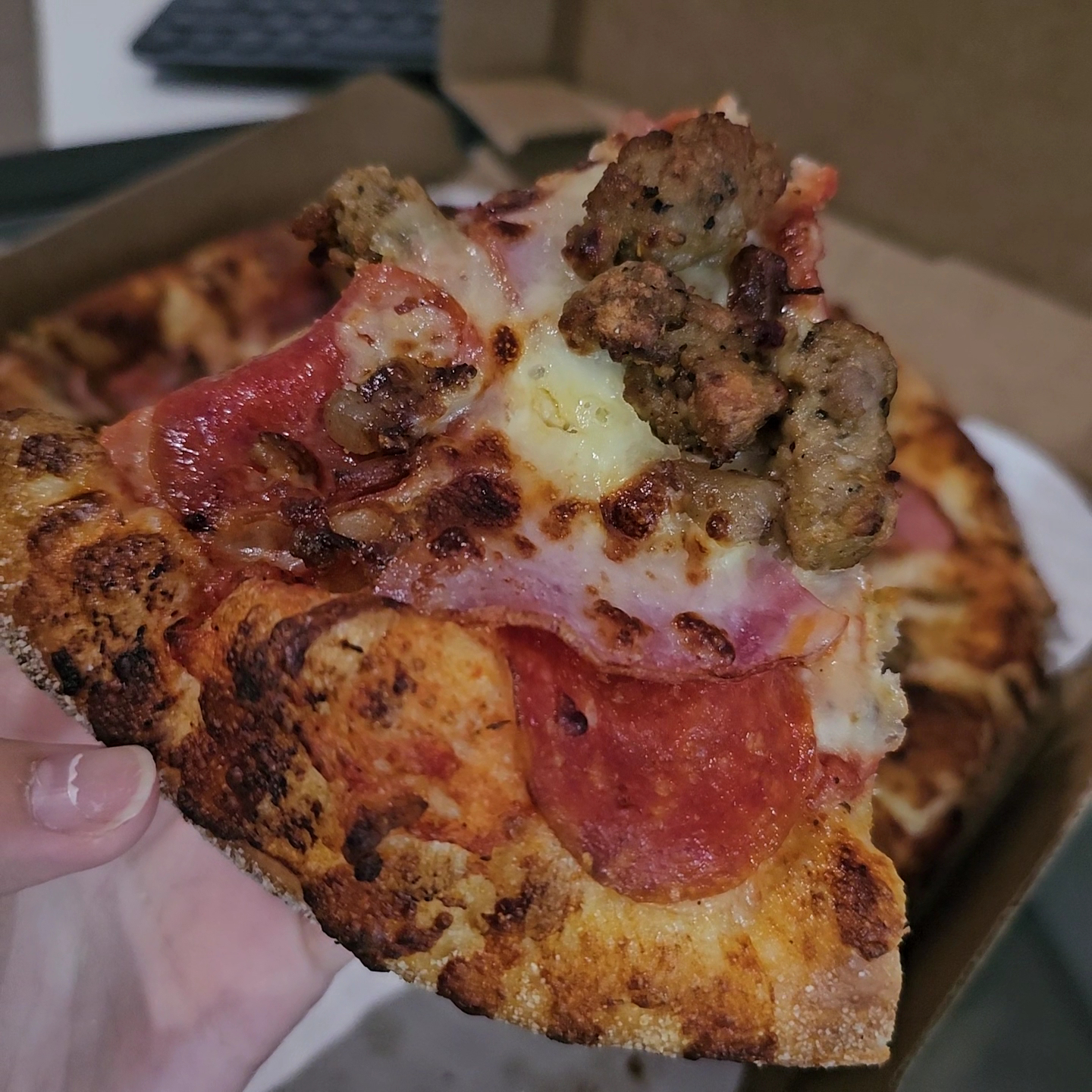 I must note that I ate the pizza about an hour after I purchased it, which might explain why the cheese wasn't stretching as it would right out of the oven. However, this didn't diminish my enjoyment of the pizza in the least. The quality of the ingredients and the savory combination of meats made it a satisfying mealš„