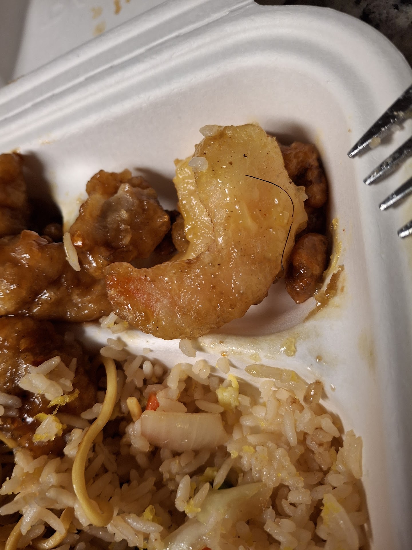 Ā Ā Ā Read moreDecided to get panda after my classes and ordered some orange chicken and honey walnut shrimp and cream cheese rangoons online. Once I got there I went up to the take out counter and was ignored.So I went up to one of the workers and then she gave me my food, and forgot my rangoons. I walked back to get them and was met with even more rudeness, but I was content I could finally go home. Just to get home and see this on my honey walnut shrimp, I will not be eating here again, they are extremely rude and dirty if their leaving hair...