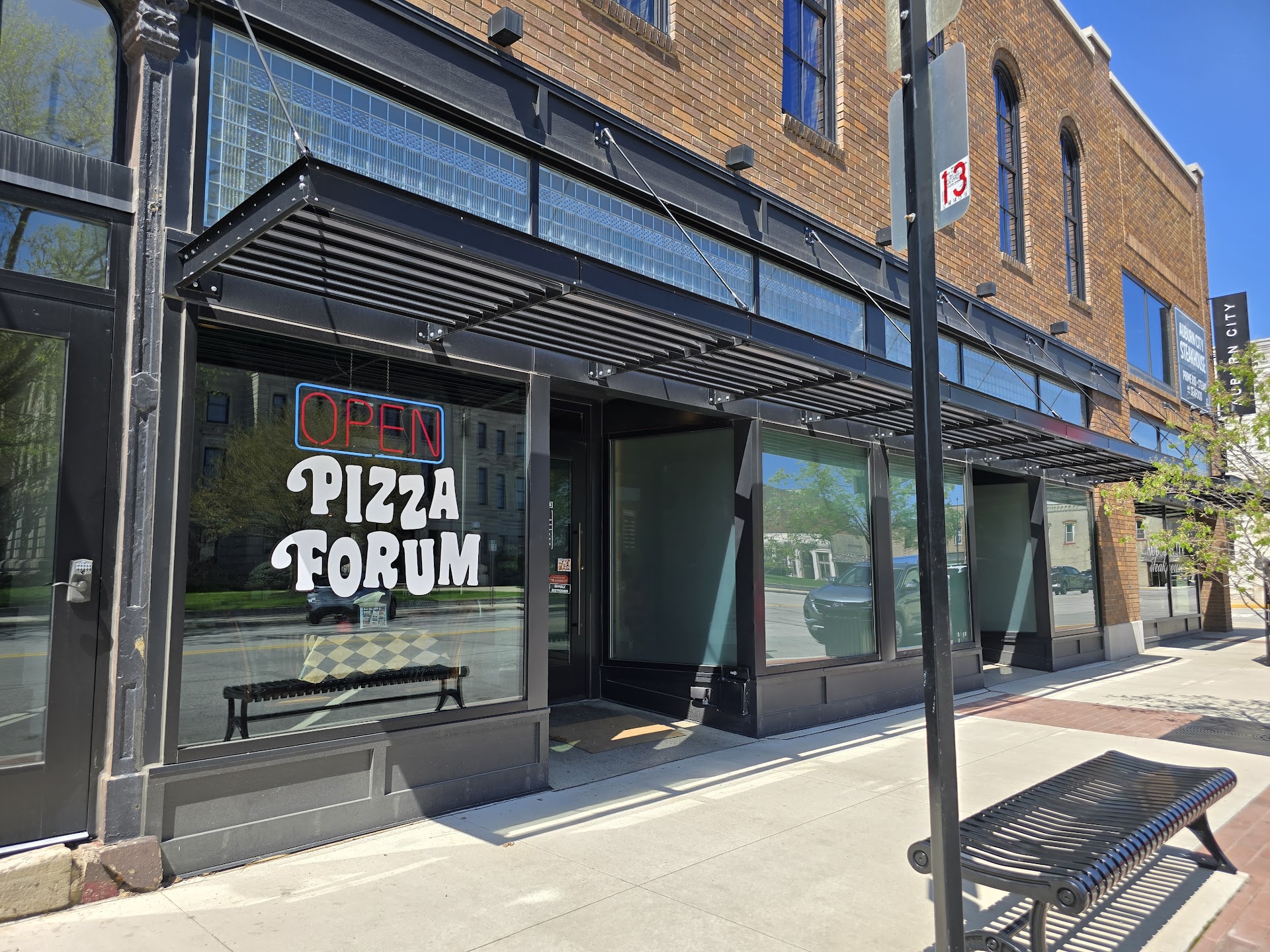 Pizza Forum has a great location in the heart of downtown Auburn right next to the courthouse. The building looks like old brick and tin ceiling, but the brick is faux. But the place screams old town pizzeria. The wood floors and pizza oven visible from the dining area really tie it all together.