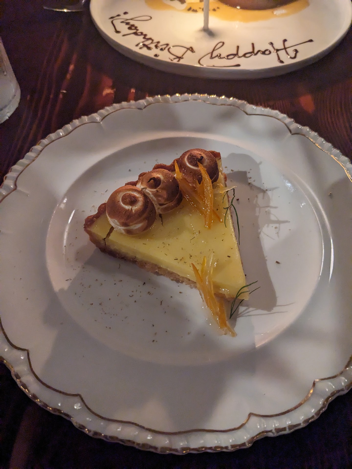 The desserts were very refined and the use of fennel pollen in the tarte au citron was fantastic. The flourless chocolate cake was essentially a ganache, and the armagnac prunes went very well with it. They decorated a plate with a candle and a beautiful happy birthday script in chocolate for my mother, which was a lovely touch.