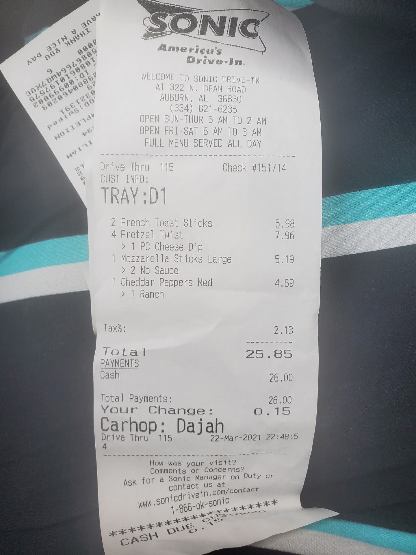 Read moreThis Sonic is kinda hit or miss. The workers all seem to be very nice and personable but the consistency of service is just weird. I've been twice in recent months (it's on my regular route lol) and time #1 I was told that they didn't have the item advertised on the billboard/sign...not like they were out but that that was a limited time offer and it's no longer available. Time #2 I pulled into one of the stalls to order and was abruptly informed that they were only doing drive thru unless there was a mobile order. Considering many places have recently added curbside which used to be a unique part of the Sonic experience, I wouldn't think this is the right time to be scaling back on that service. I mean, the carhop, the stalls, the staying in your car...that's all part of the Sonic thing and often why I've chosen to visit any Sonic location. But it's conveniently located for me, my order hasn't ever been wrong, and they are generally pretty pleasant. So...