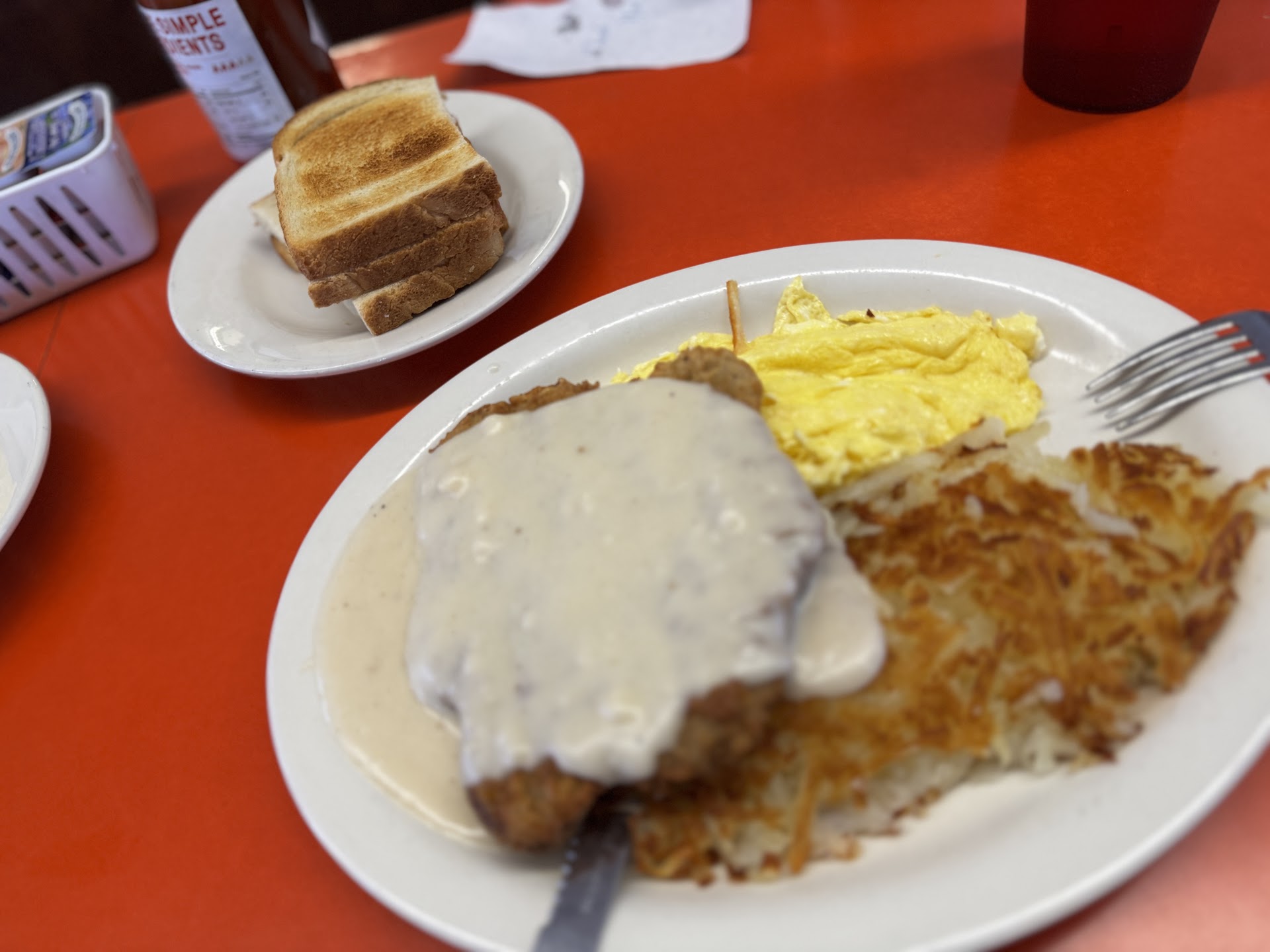 That being said, the food itself was decent. The chicken fried steak, for example, was flavorful and cooked well, though not the best I’ve had. However, the French toast was underwhelming—it seemed like it was just dipped in batter and quickly fried, making it very basic and lacking the richness or depth of flavor that good French toast should have.