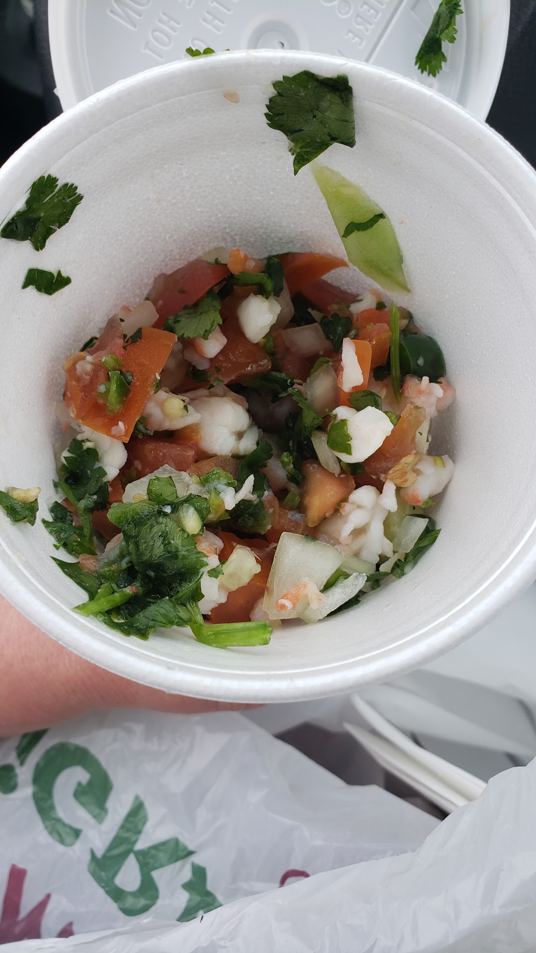 Read moreCeviche tasted very good, good amount of shrimp and fresh. Unfortunately I purchased 3 at $3 each and there was about 1.5 worth of ceviche to cover the tostada chips. Also overall quite small. Sheimp look pre-cooked.